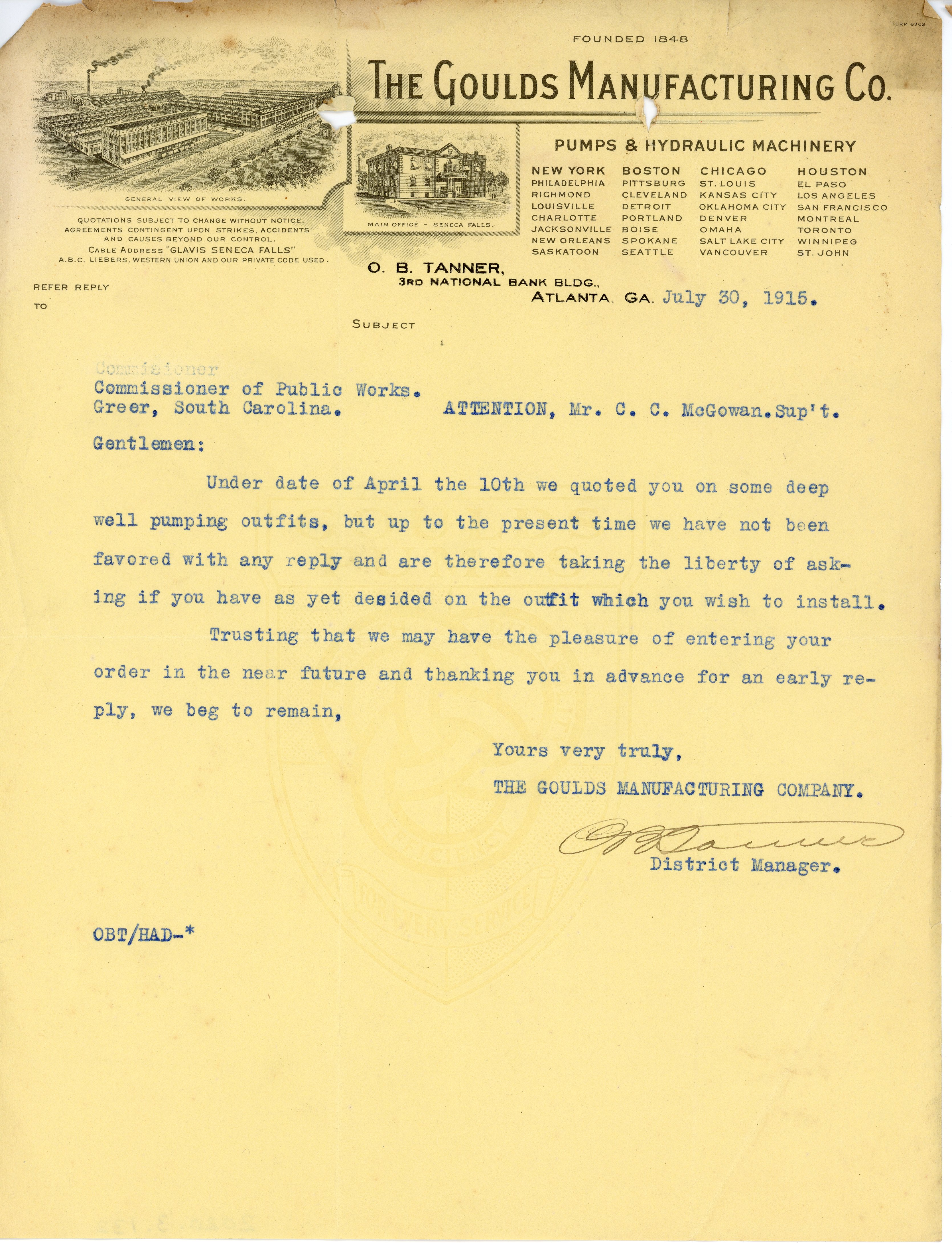 - Letter 30 July 1915 O. B. T. [illegible] to C. C. McGowan