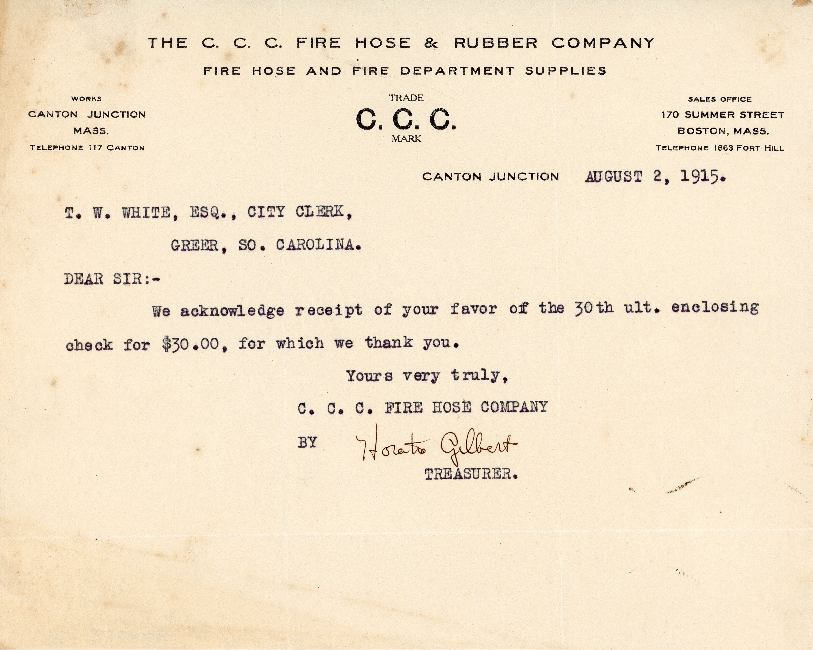 Letter 2 August 1915 H. Gilbert to T. W. White