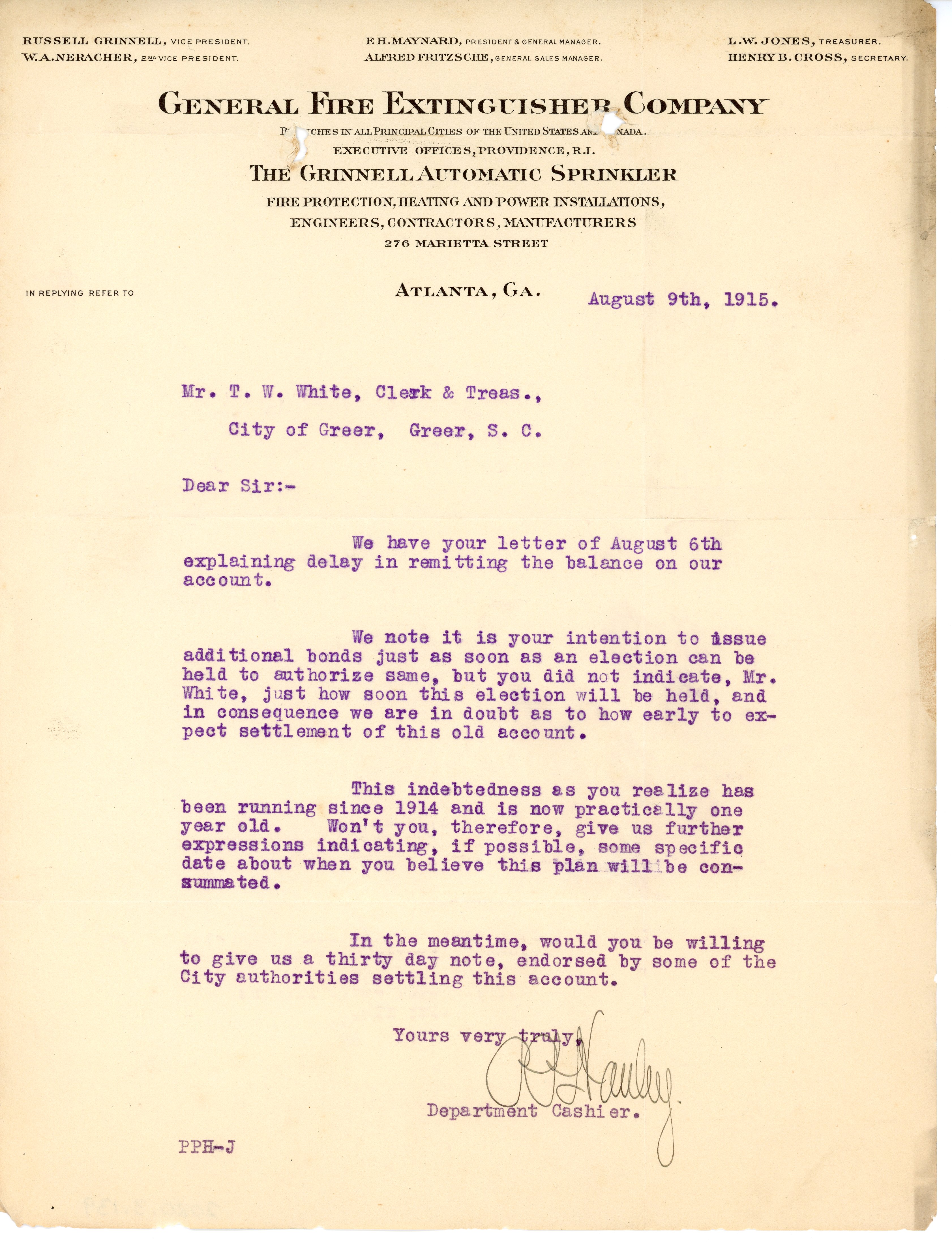 Letter 9 August 1915 P. P. Hauley to T. W. White