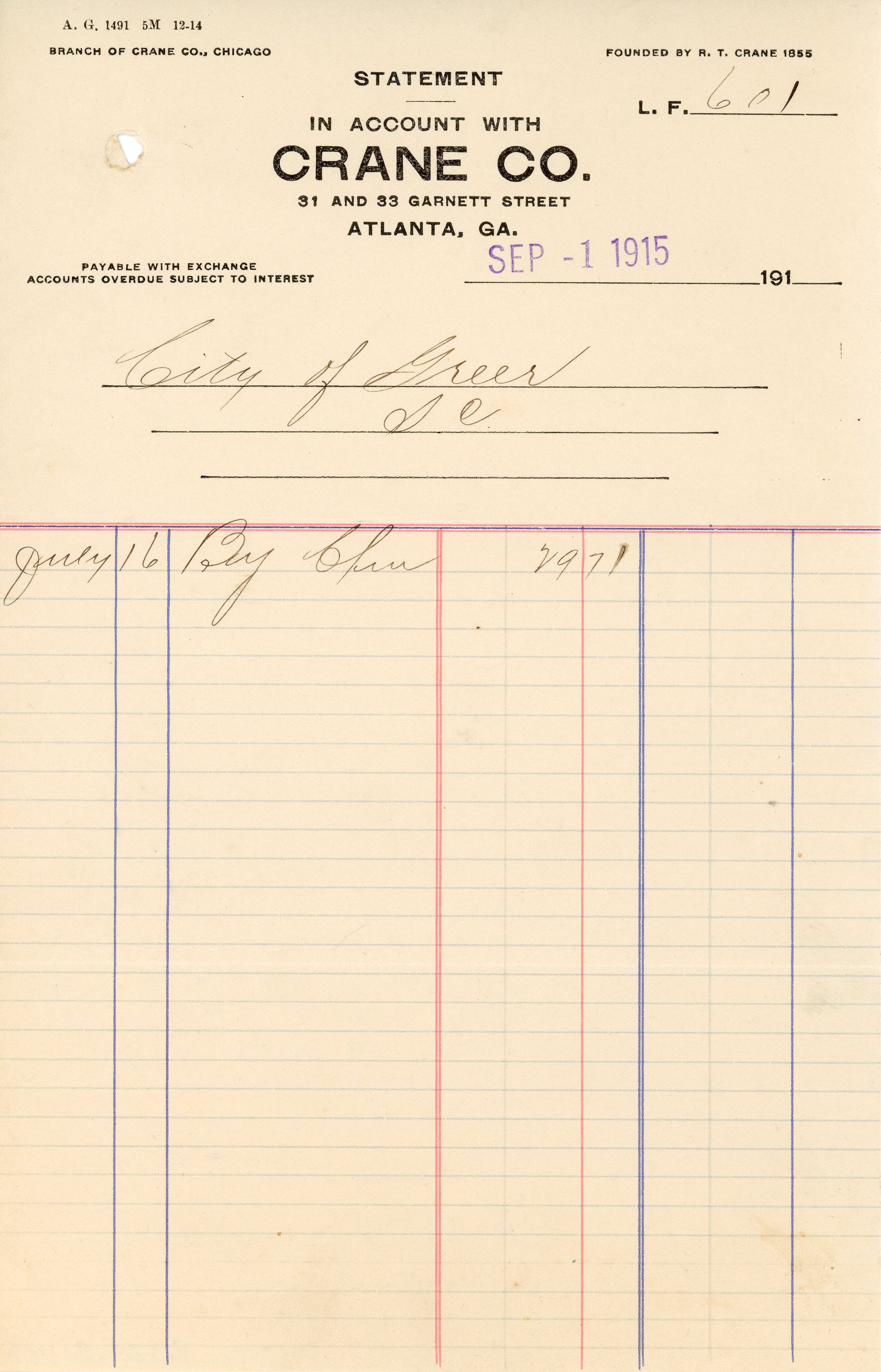 - Invoice 1 September 1915 Crane Co. to City of Greer, Greer, S. C.