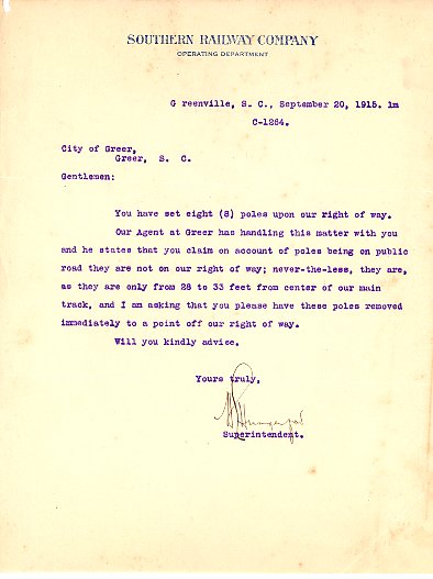 Part of Letter 20 September 1915 H. L. H. [illegible] to City of Greer, Greer, S. C.