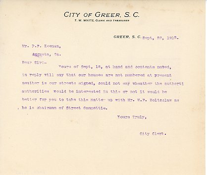 Letter 22 September 1915 T. W. White to P. F. Keenan