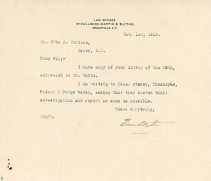 Letter 1 October 1915 E. M. B. [illegible] to J. A. Robinson
