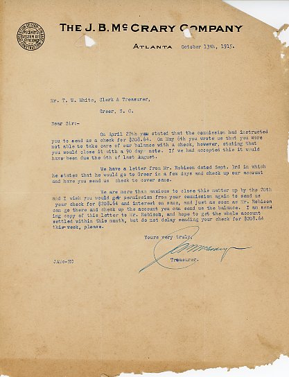 Letter 13 October 1915 J. A. McCrary to T. W. White
