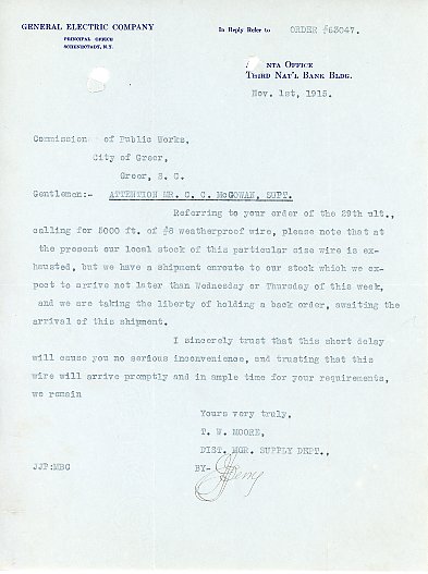 Part of Letter 1 November 1915 J. J. P. [illegible] by T. W. Moore to Commission of Public Works c/o C. C. McGowan