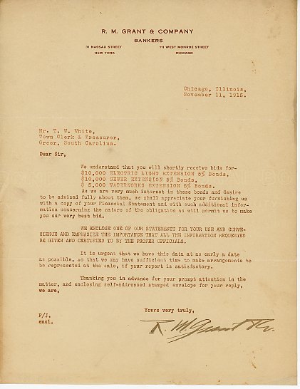- Letter 11 November 1915 R. M Grant to T. W. White