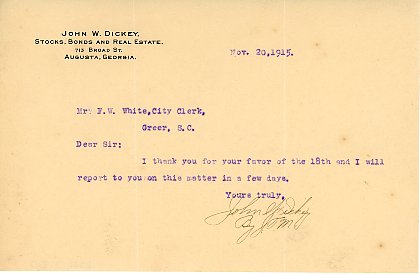 - Letter 20 November 1915 J. W. Dickey to F. W. White [T. W. White]