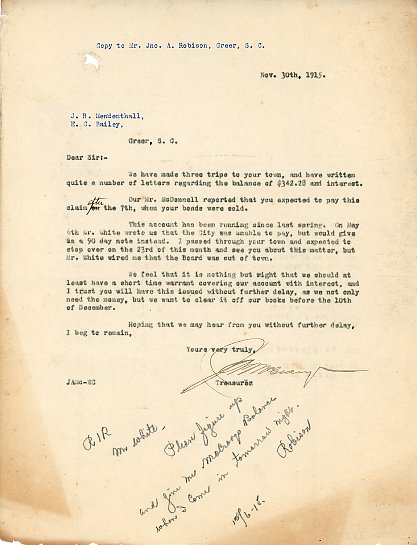 Part of Letter 30 November 1915 J. A. Mc [illegible] to J. B. Mendenhall & E. C. Bailey & J. A. Robison [J. A. Robinson]