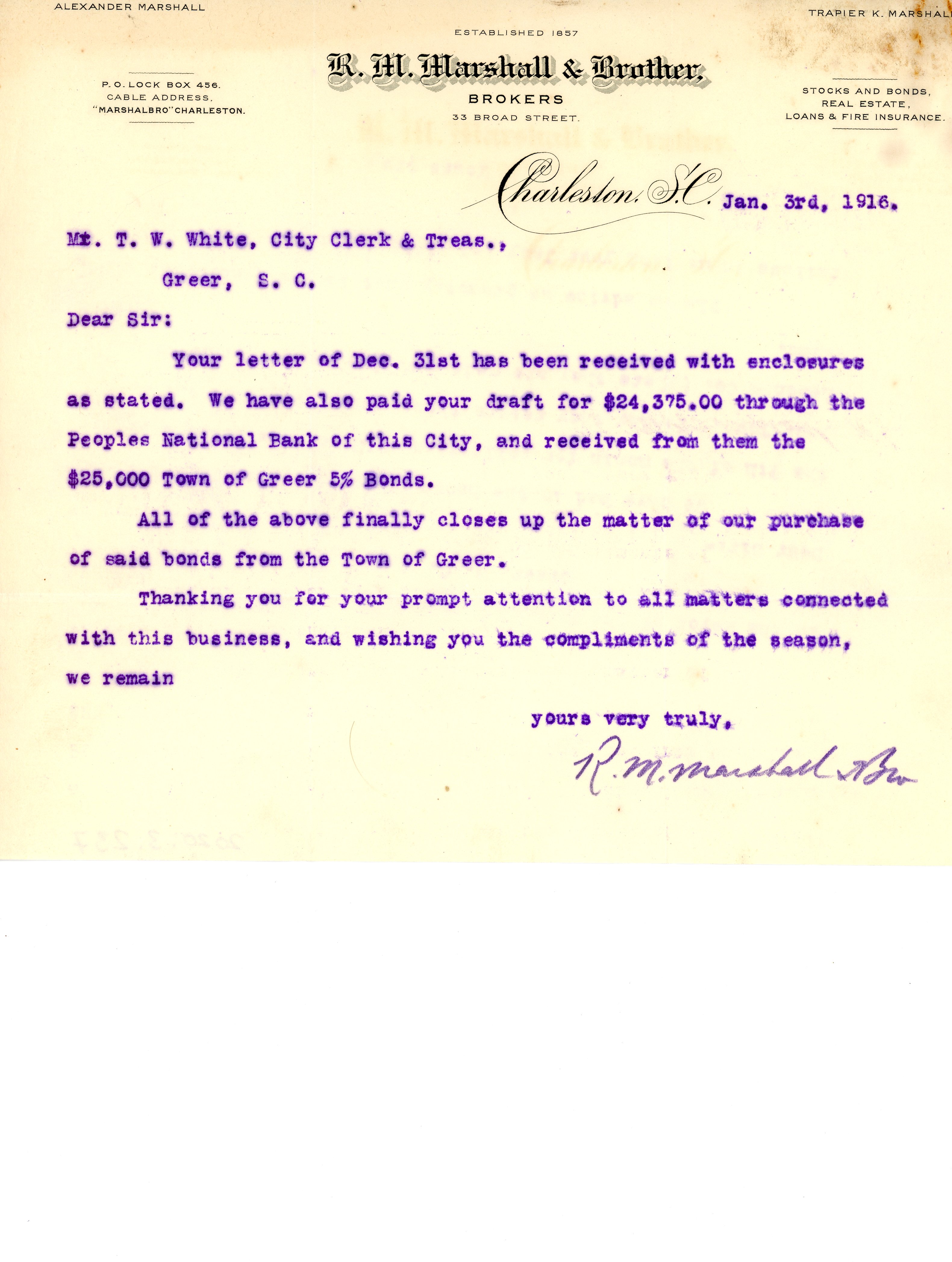 Letter 3 January 1916 R. M. Marshall to T. W. White