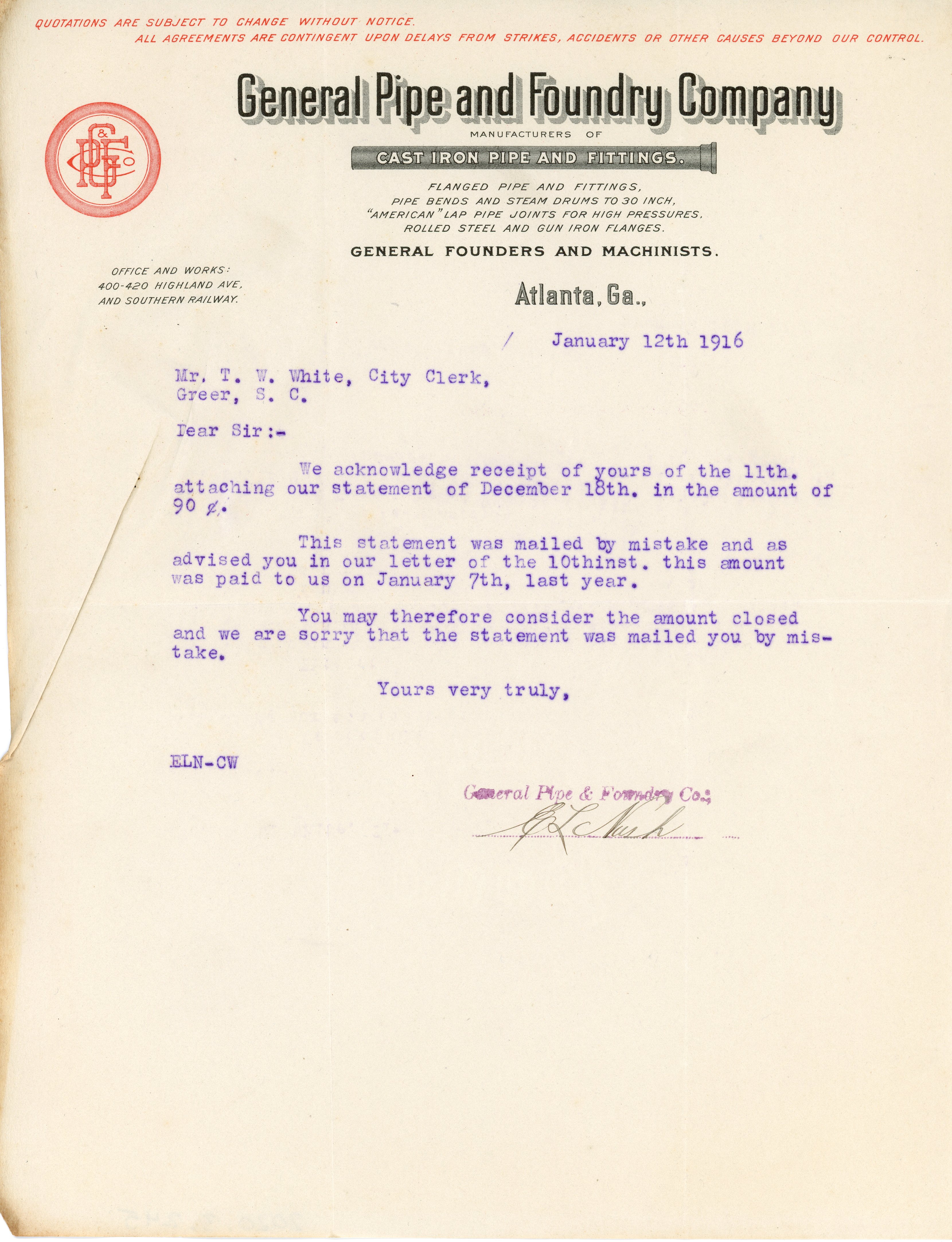 - Letter 12 January 1916 E. L. N. [illegible] to T. W. White