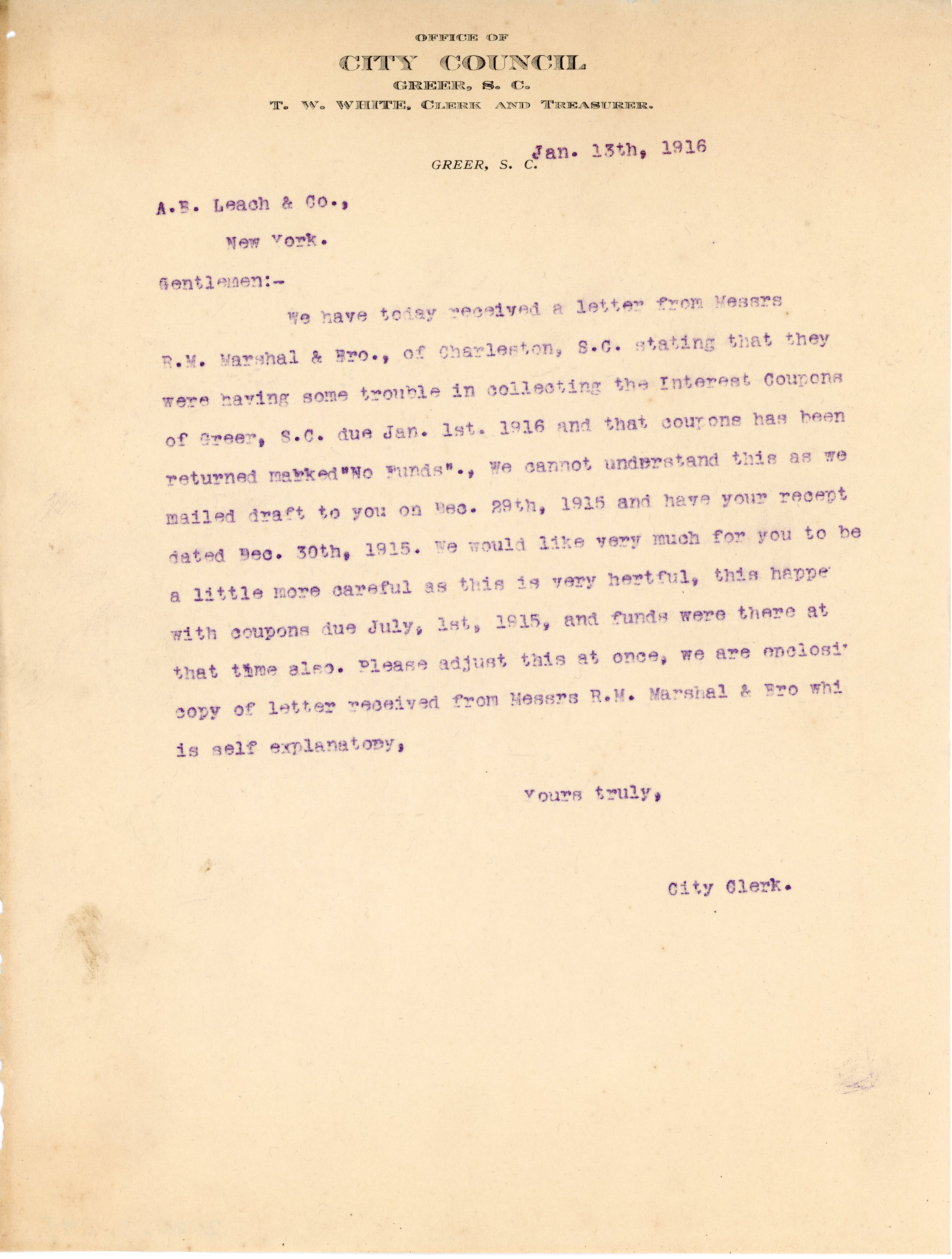 - Letter 13 January 1916 T.W. White to A. B. Leach & Co.