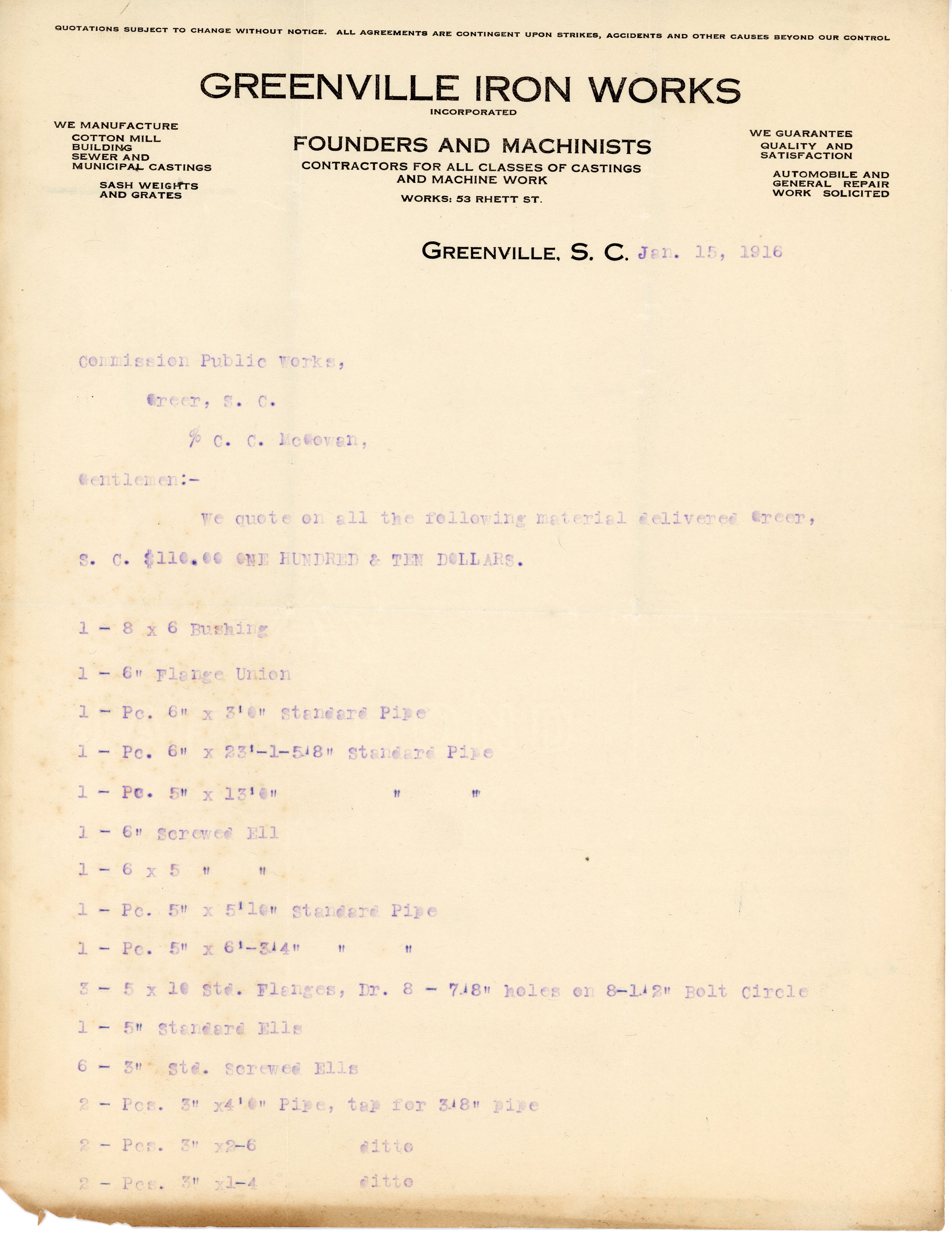 Part of Quote Proposal 15 January 1916 J. M. Broom to Commission Public Works, Greer, S. C.