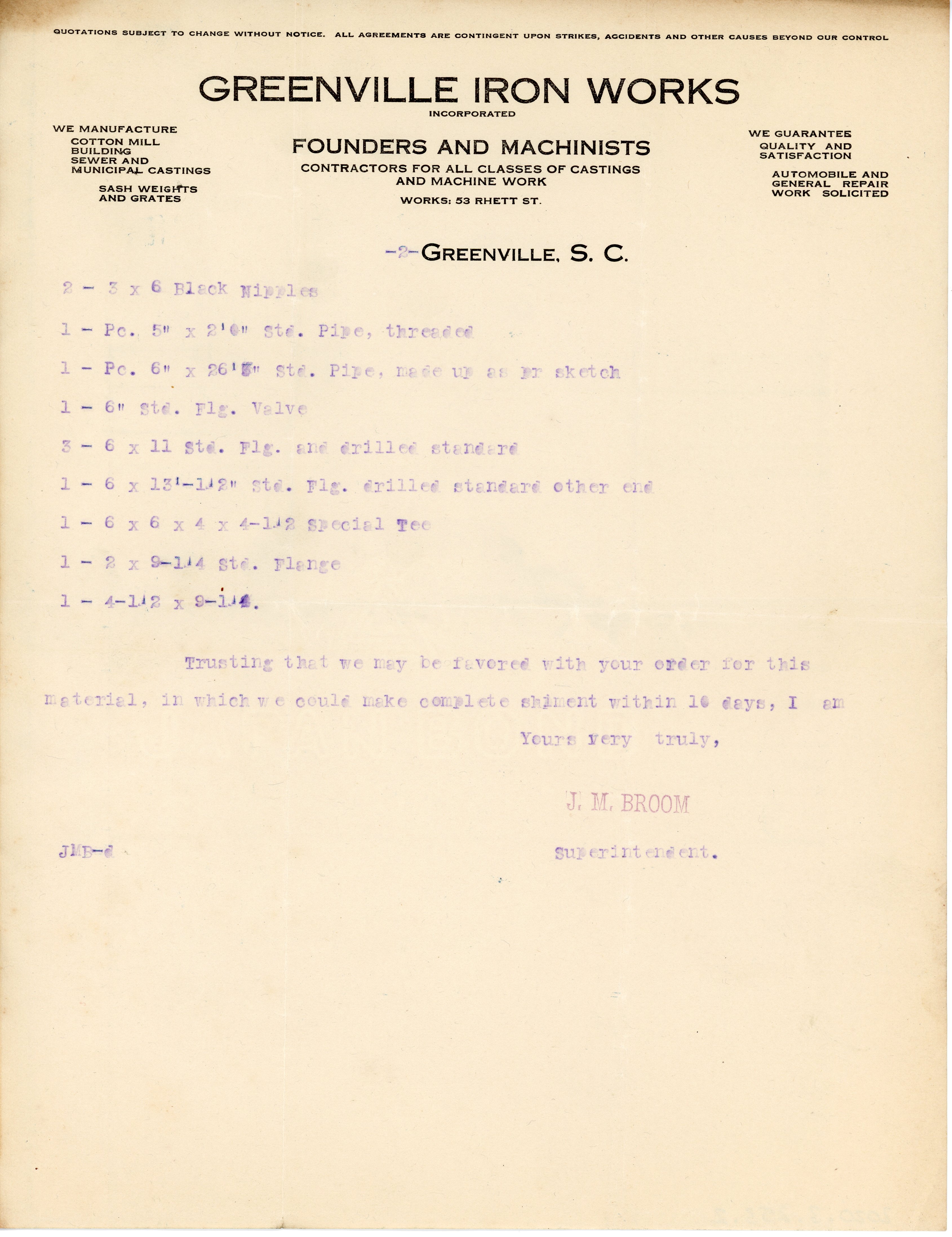 Part of Quote Proposal 15 January 1916 J. M. Broom to Commission Public Works, Greer, S. C.