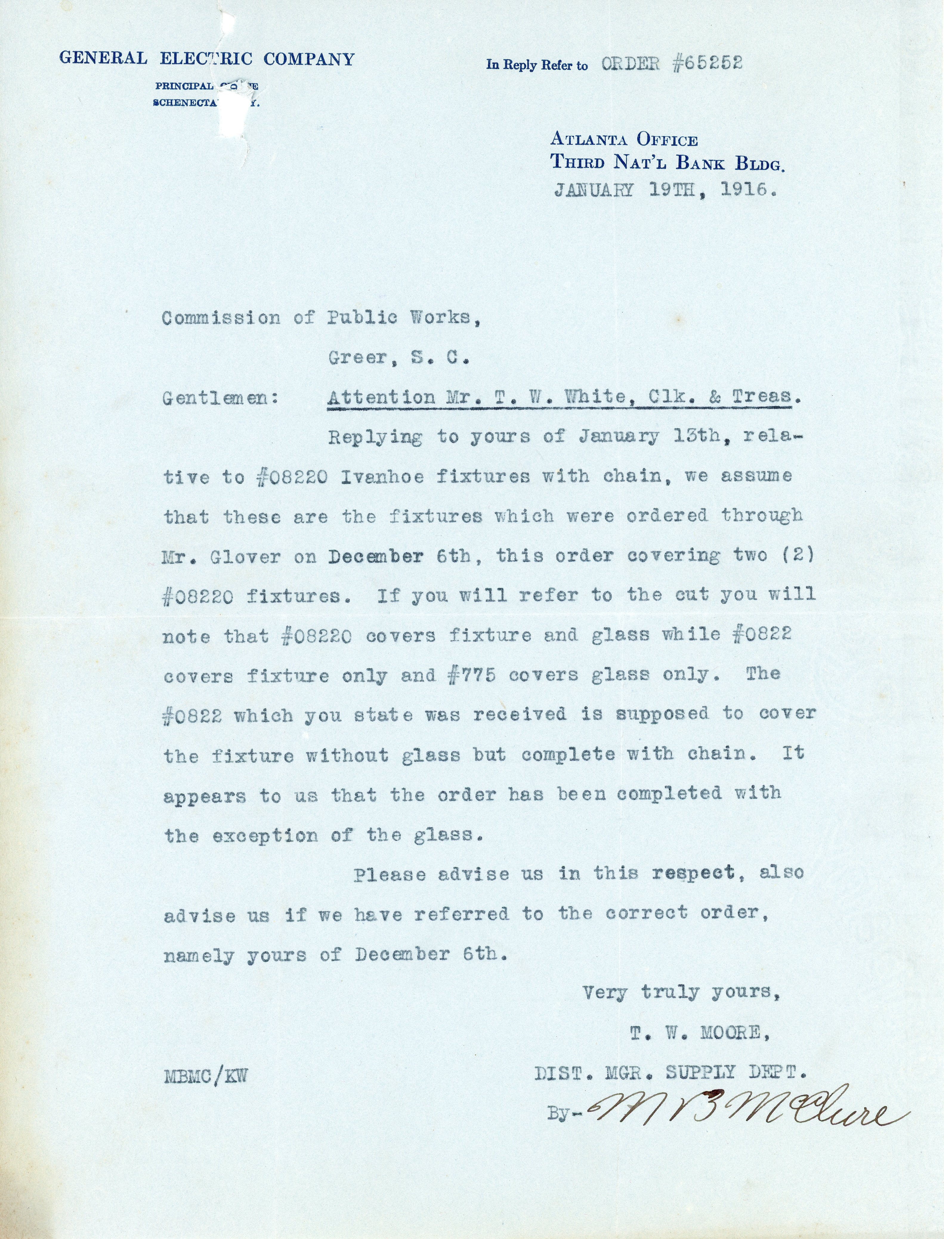 - Letter 19 January 1916 M. B. McClure to Commission of Public Works, Greer, S. C.