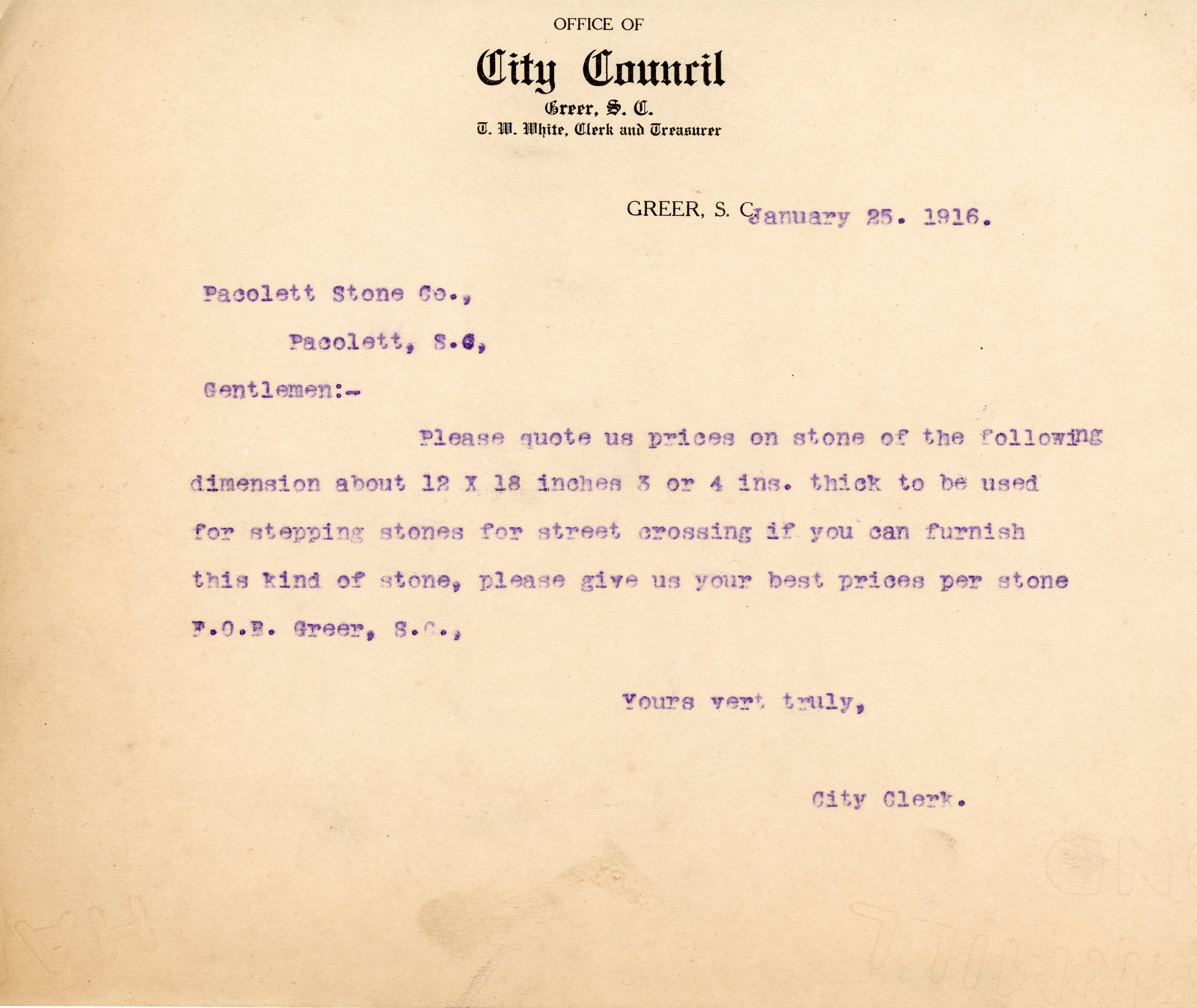 - Letter 25 January 1916 T. W. White to Pacolett Stone Co.