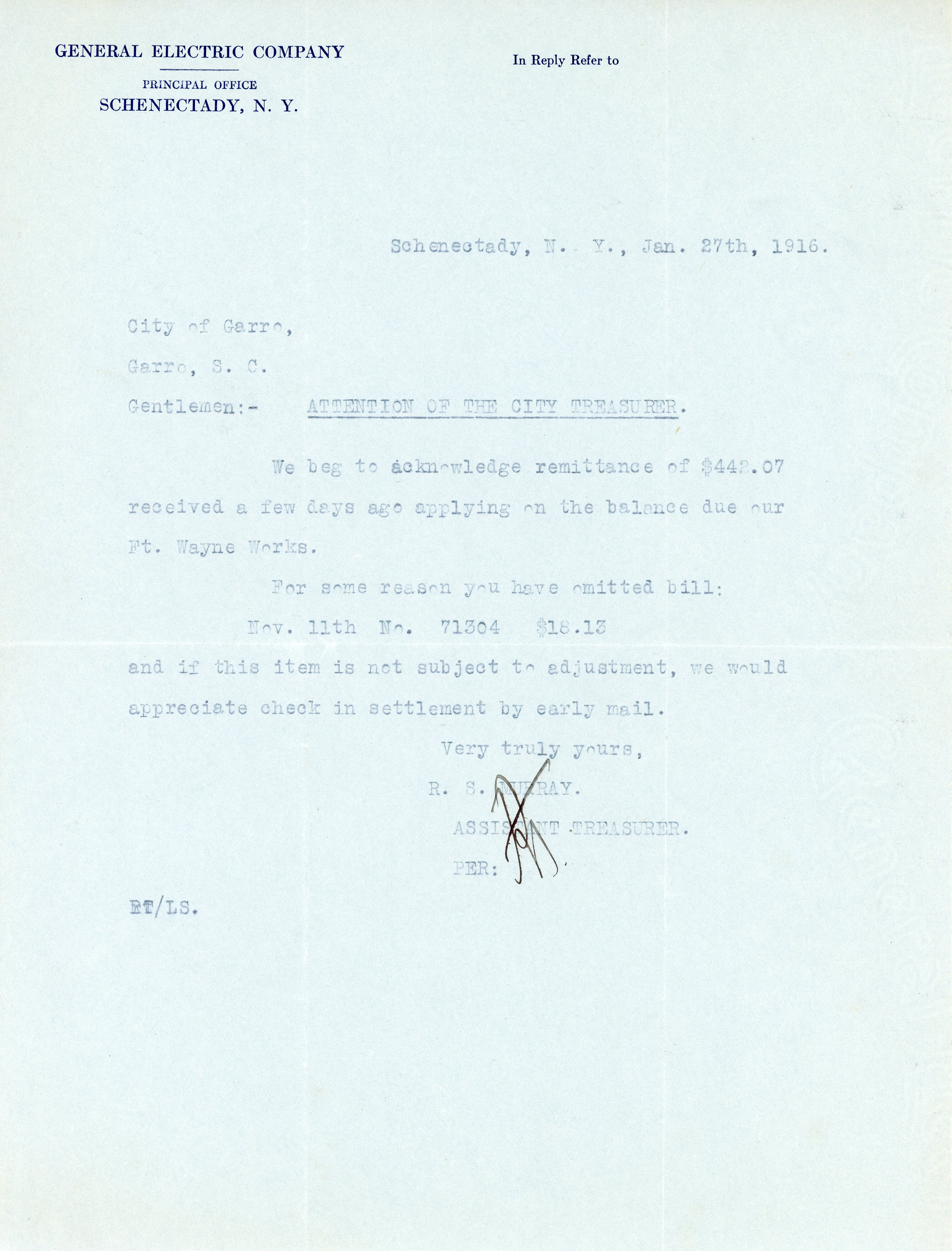 - Letter 27 January 1916 R. S. Murray to Greer, S. C.