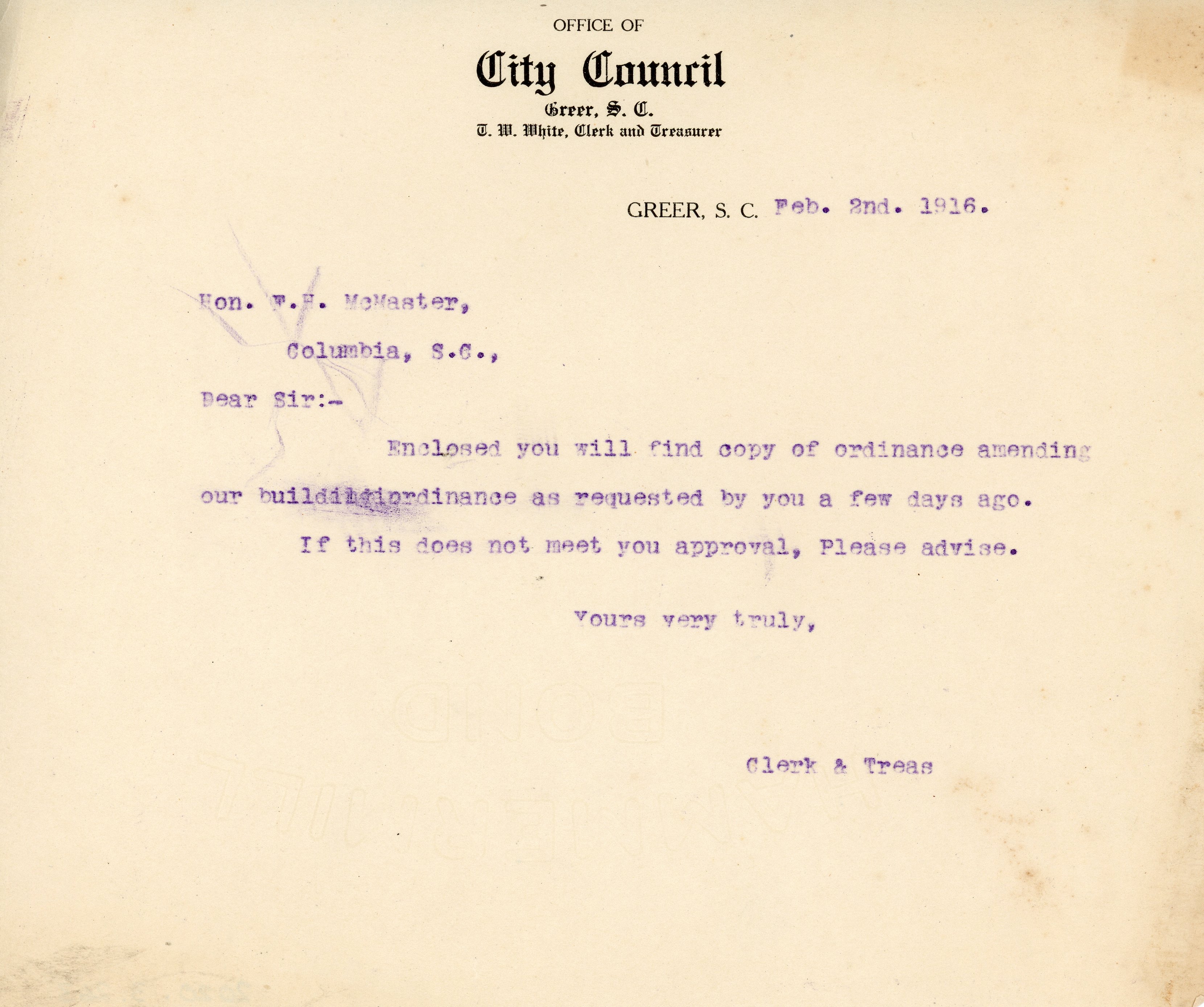 Letter 2 February 1916 T. W. White to F. H. McMaster