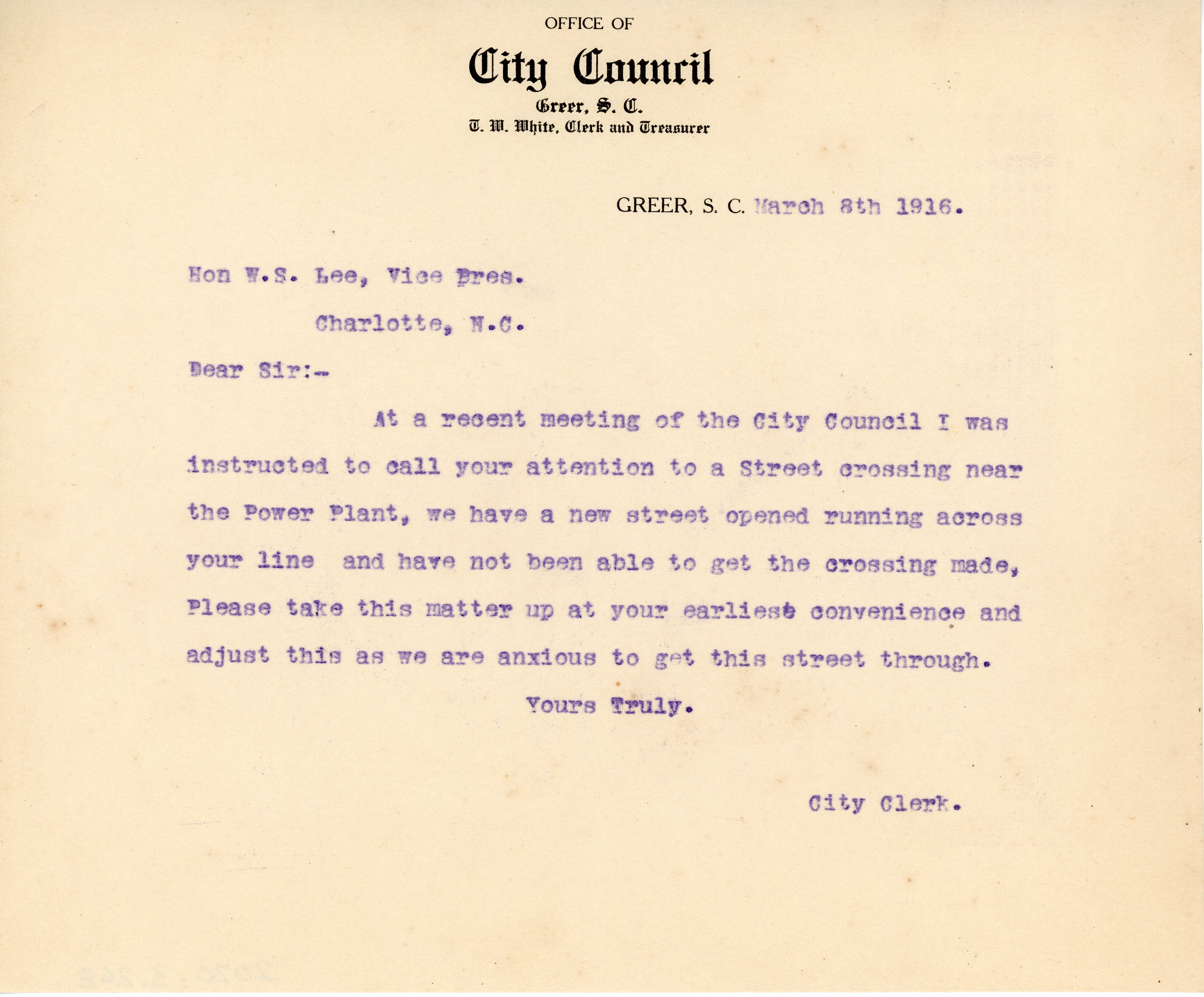 Letter 8 March 1916 T. W. White to W. S. Lee
