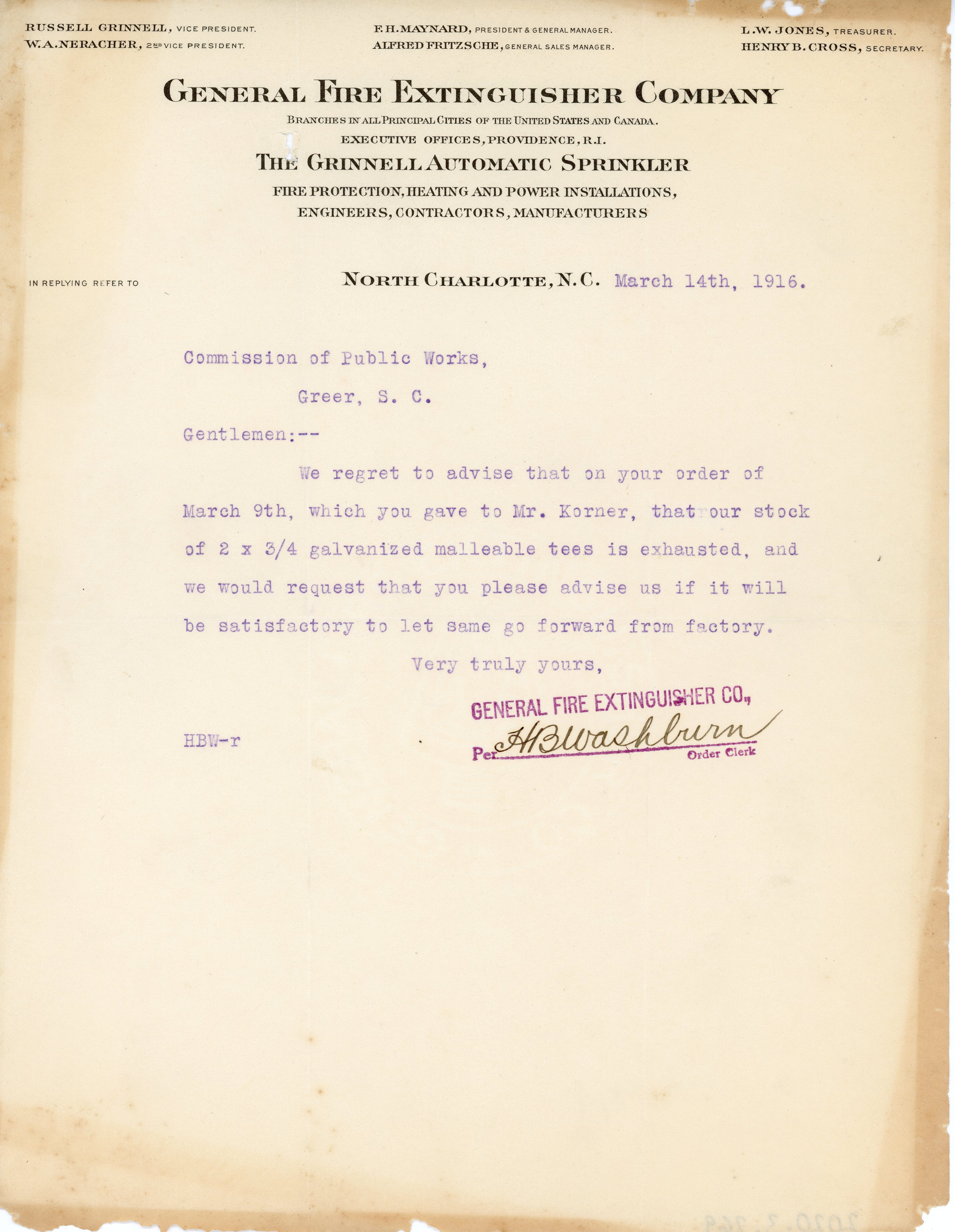 - Letter 14 March 1916 H. B. Washburn to Commission of Public Works, Greer, S. C.
