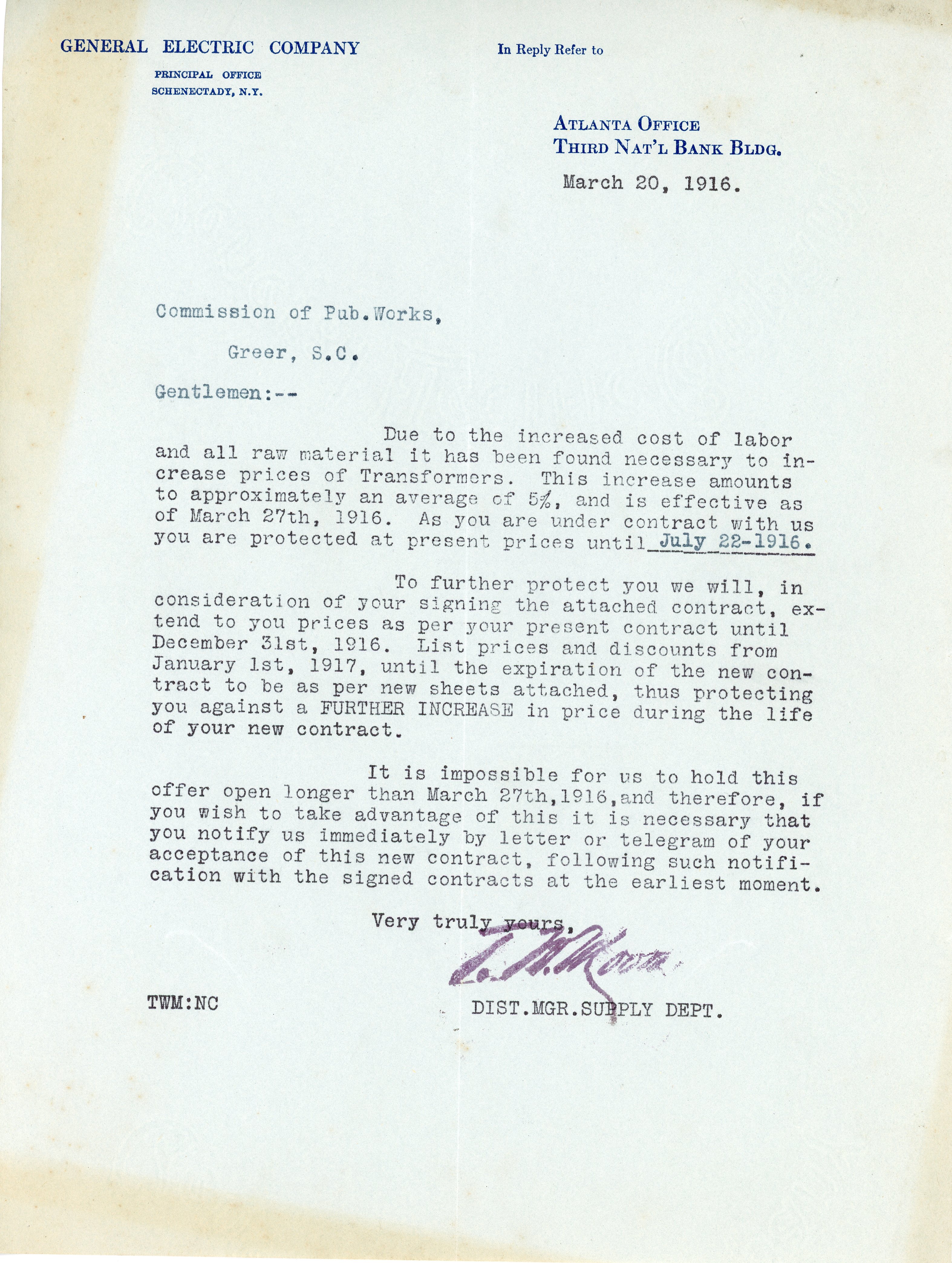 - Letter 20 March 1916 T. W. M. [illegible] to Commission of Public Works, Greer, S. C.