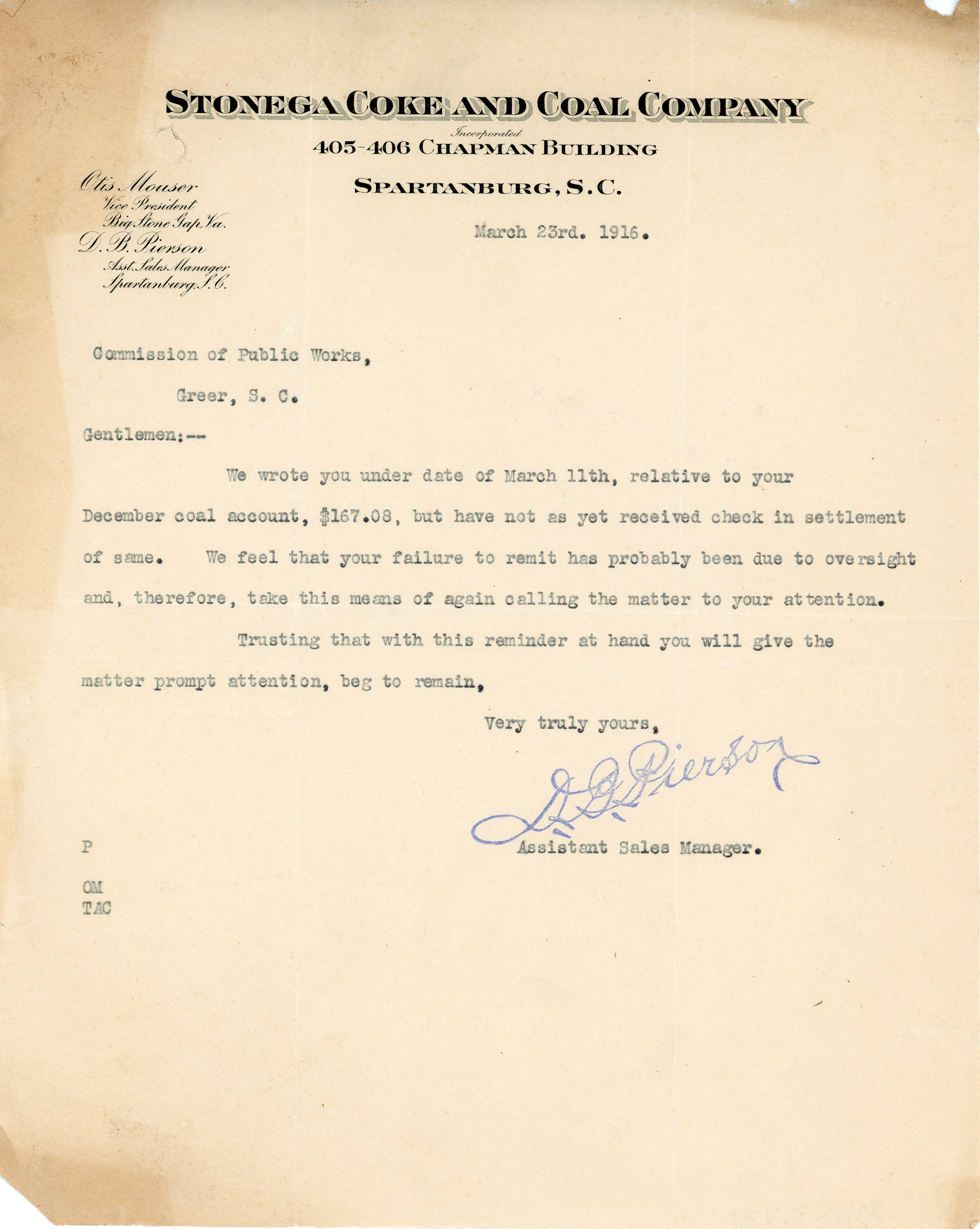 - Letter 23 March 1916 D. B. Pierson to Commission of Public Works, Greer, S. C.