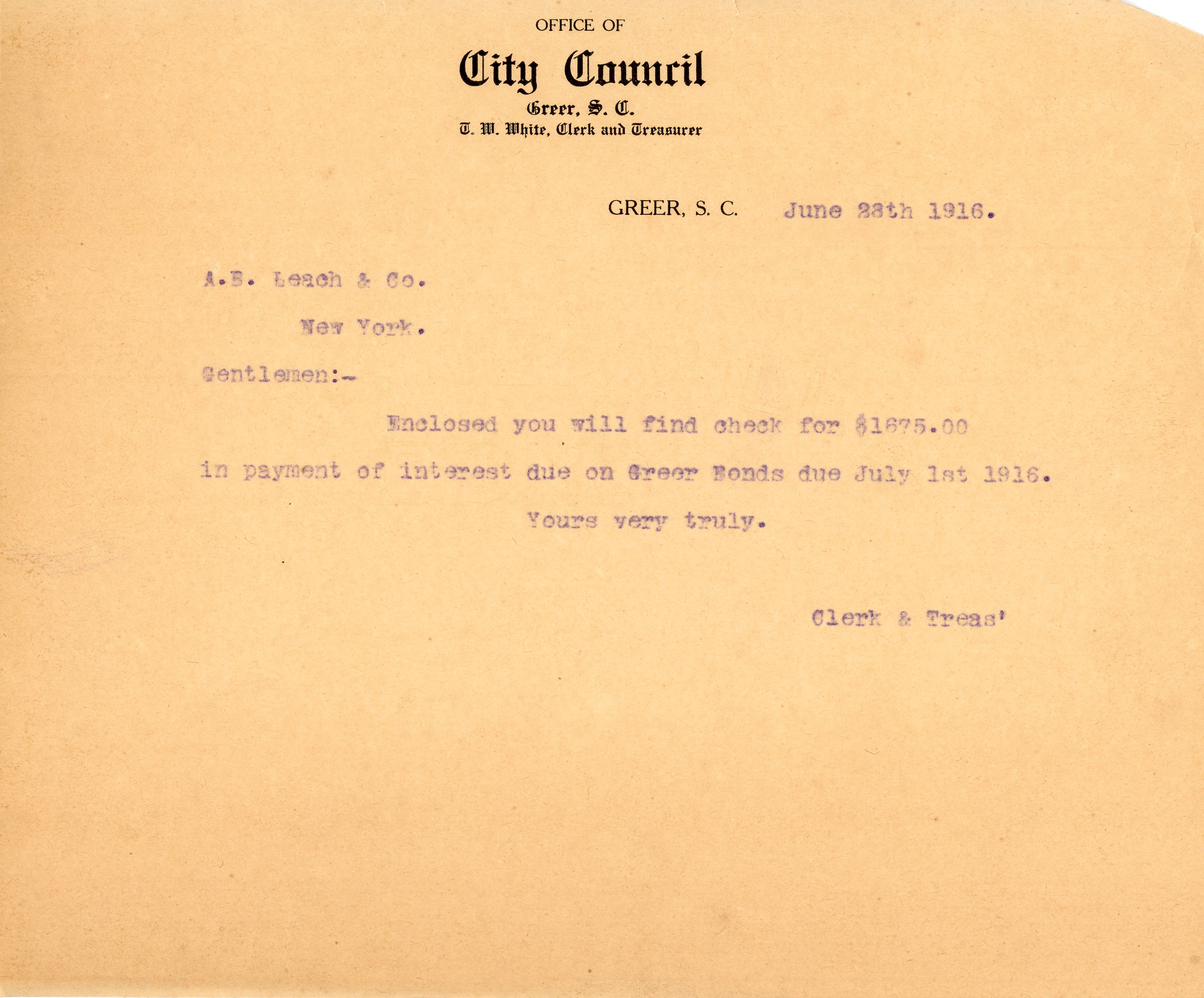 - Letter 28 June 1916 T. W. White to A. B. Leach & Co.