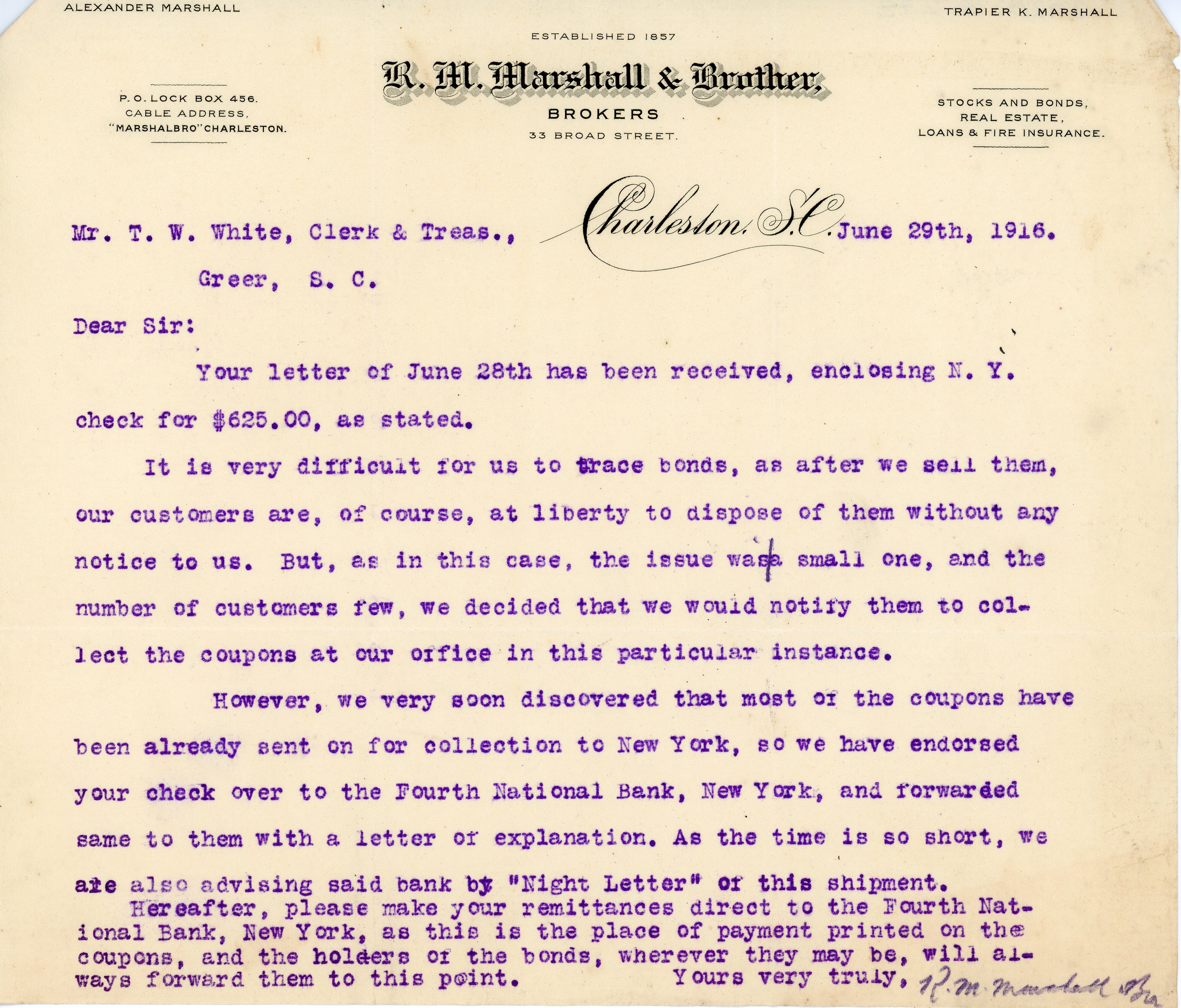 - Letter 29 June 1916 R. M. Marshall & Brother to T. W. White