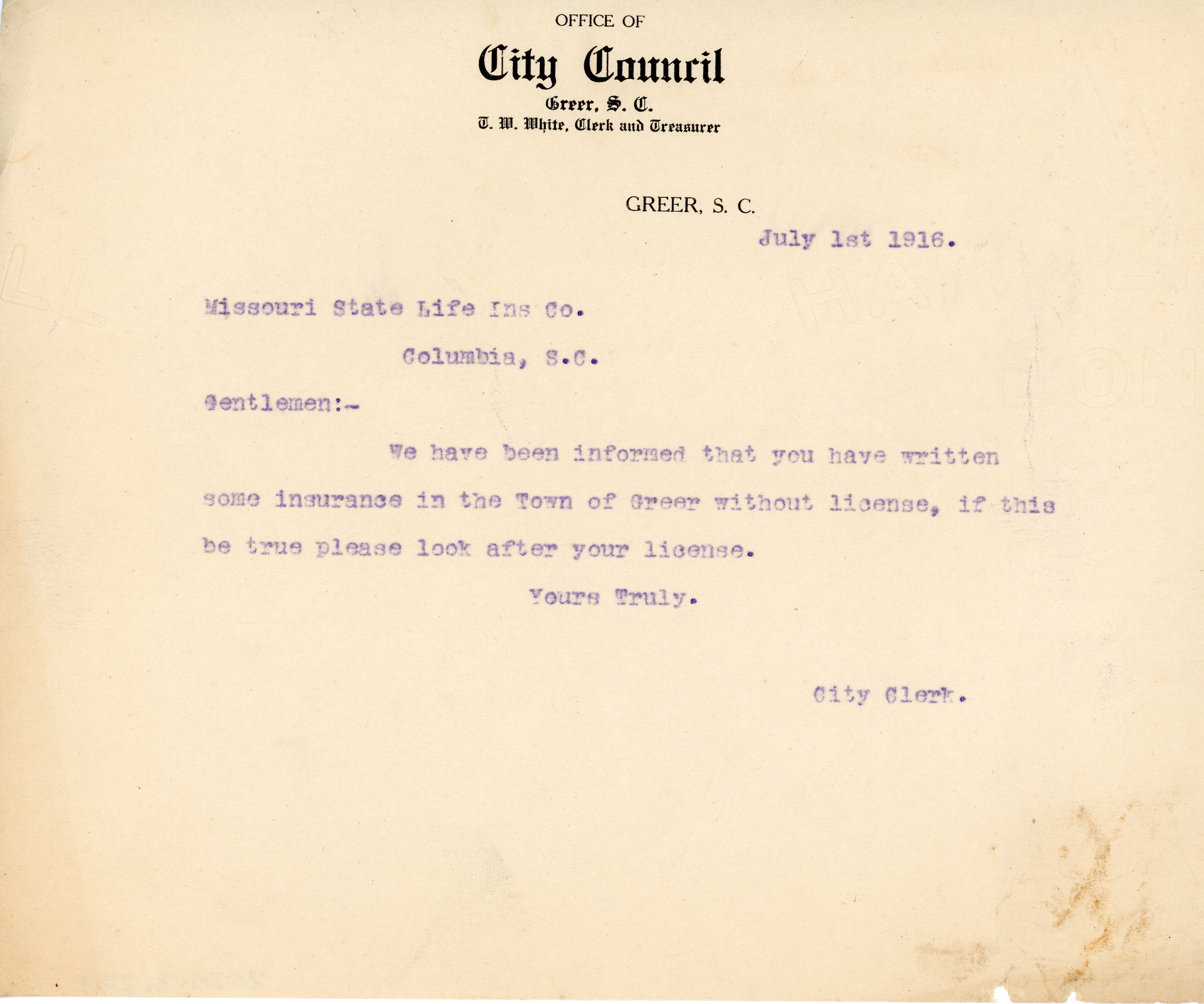 - Letter 1 July 1916 T. W. White to Missouri State Life Insurance Co.
