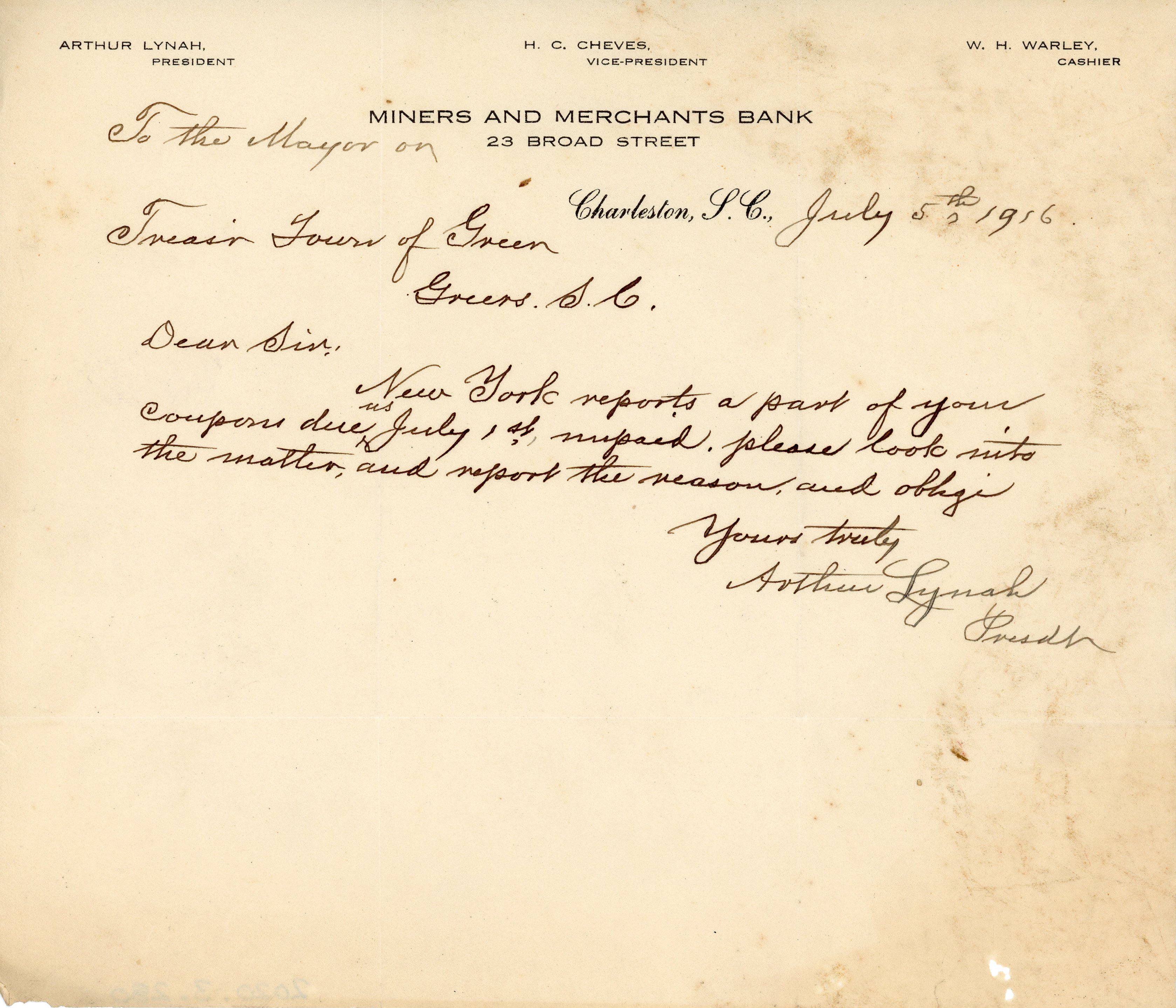 Letter 5 July 1916 A. Lynah to Mayor T. E. Smith