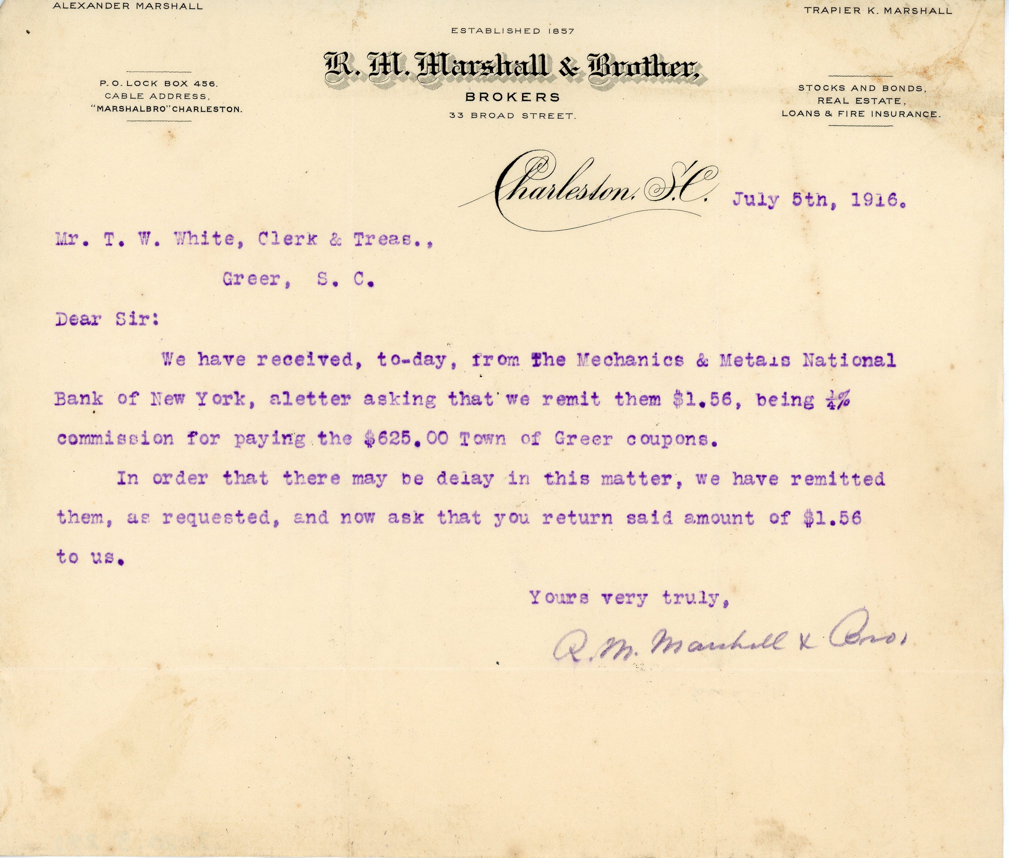 Letter 5 July 1916 R. M. Marshall & Brother to T. W. White