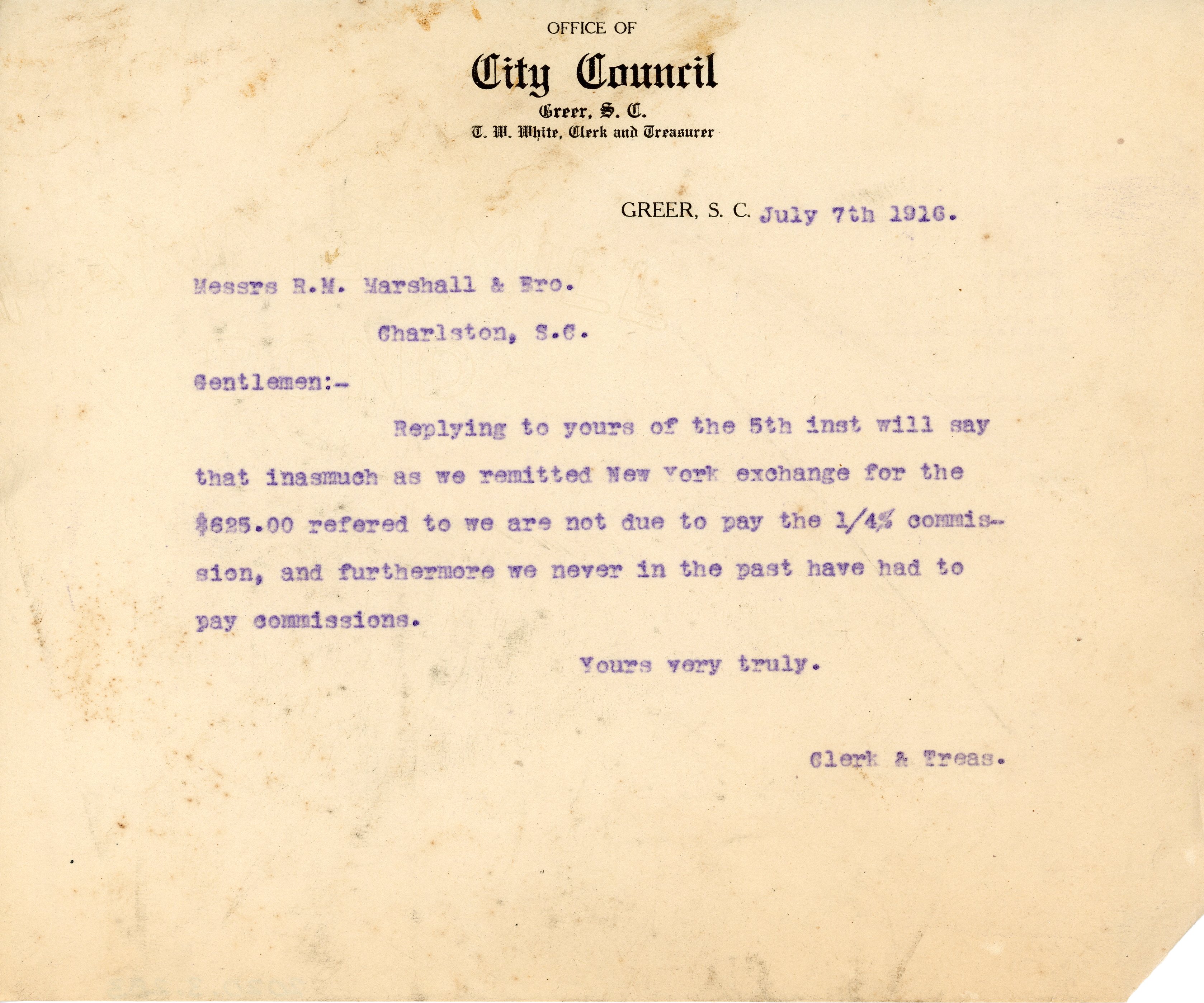 - Letter 7 July 1916 T. W. White to R. M. Marshall & Brother