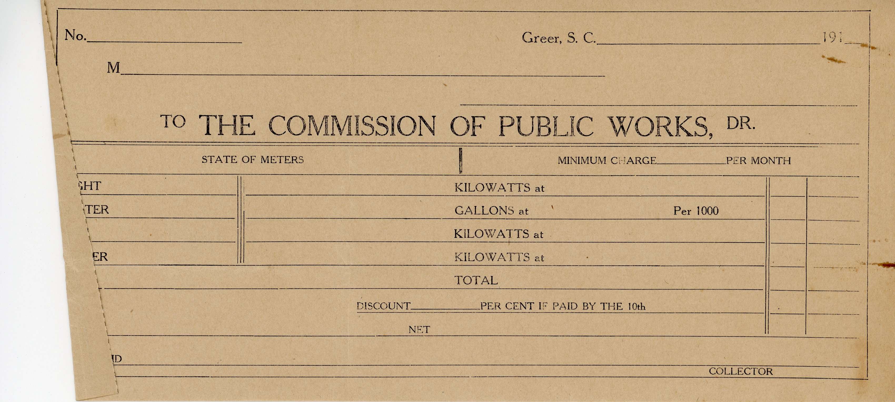 Invoice to Commission of Public Works Empty Greer, S. C.