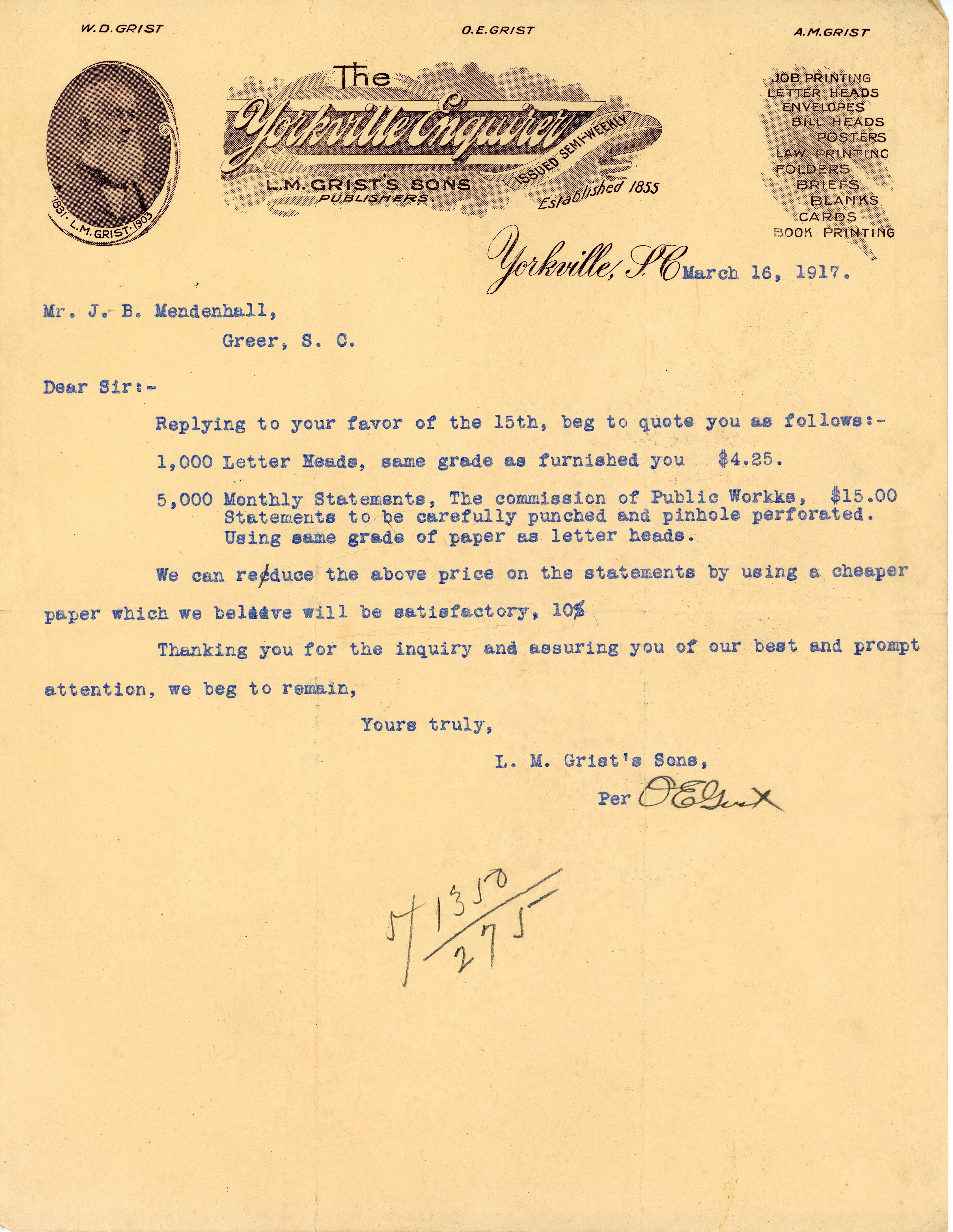 Letter 16 March 1917 L. M. Grist's Sons Per O. E. Grist to J. B. Mendenhall