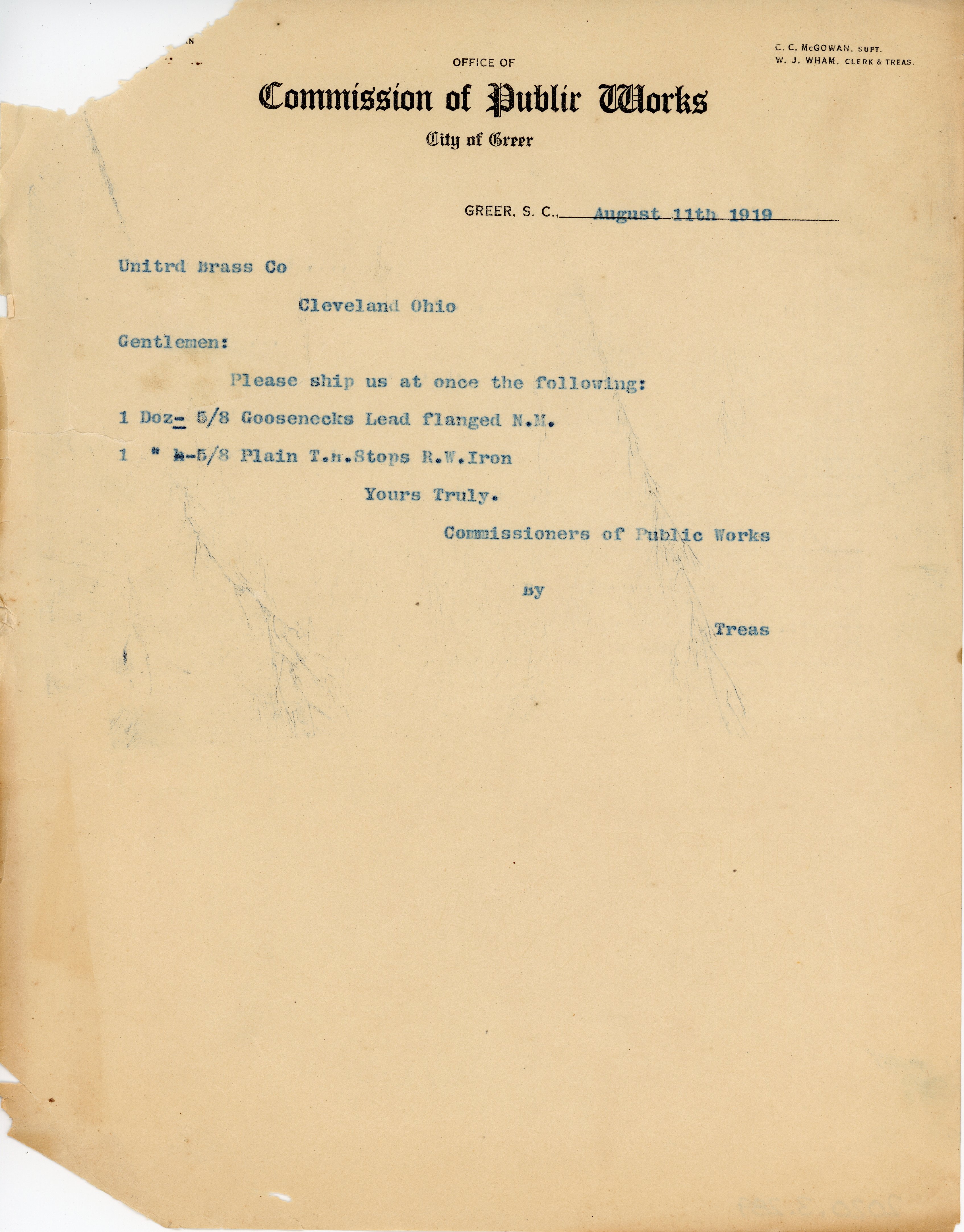 - Letter 11 August 1919 W. J. Wham to United Brass Co.