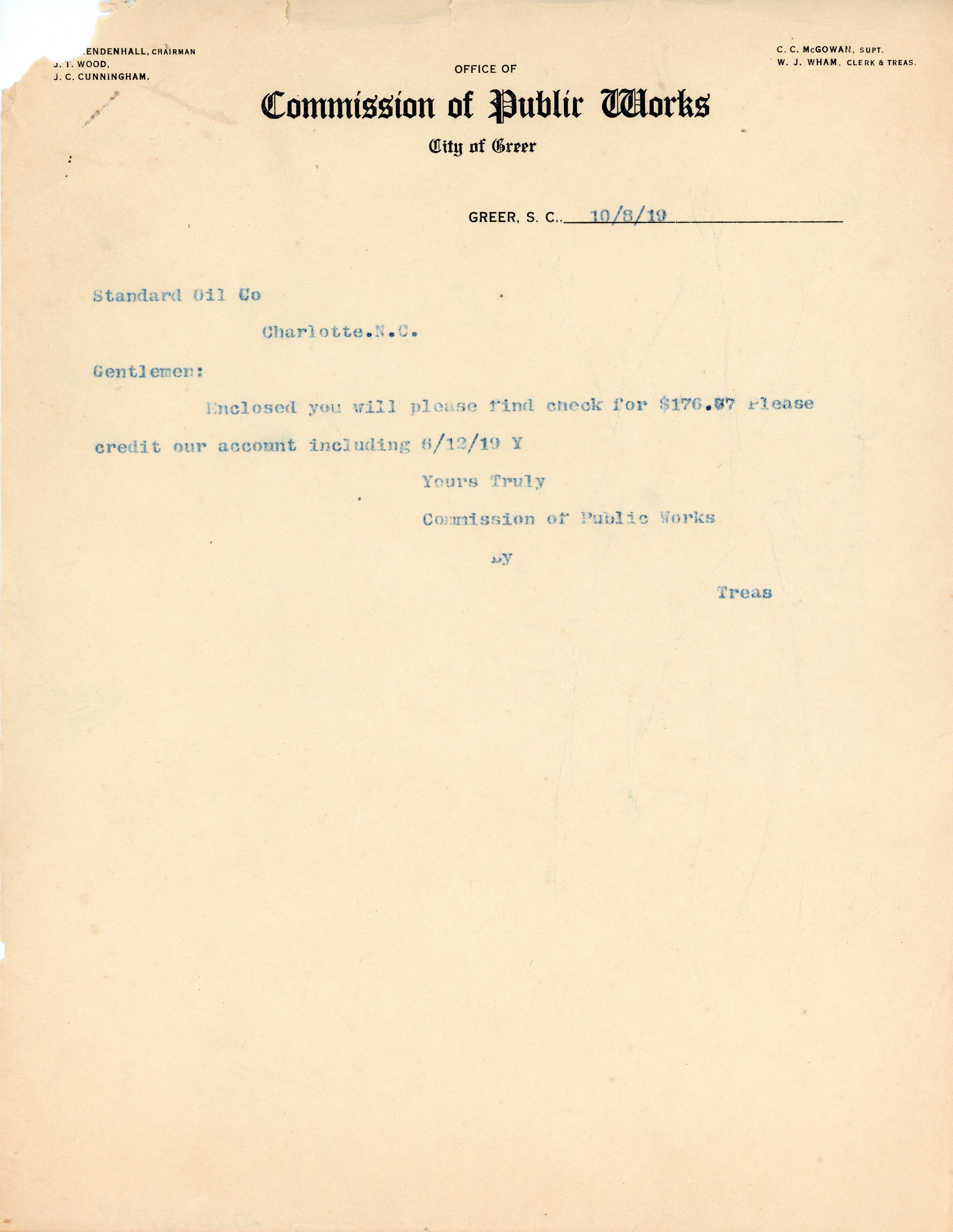 Letter 3 October 1919 W. J. Wham to T. E. Sharp Roadmaster Southern Railway Co.