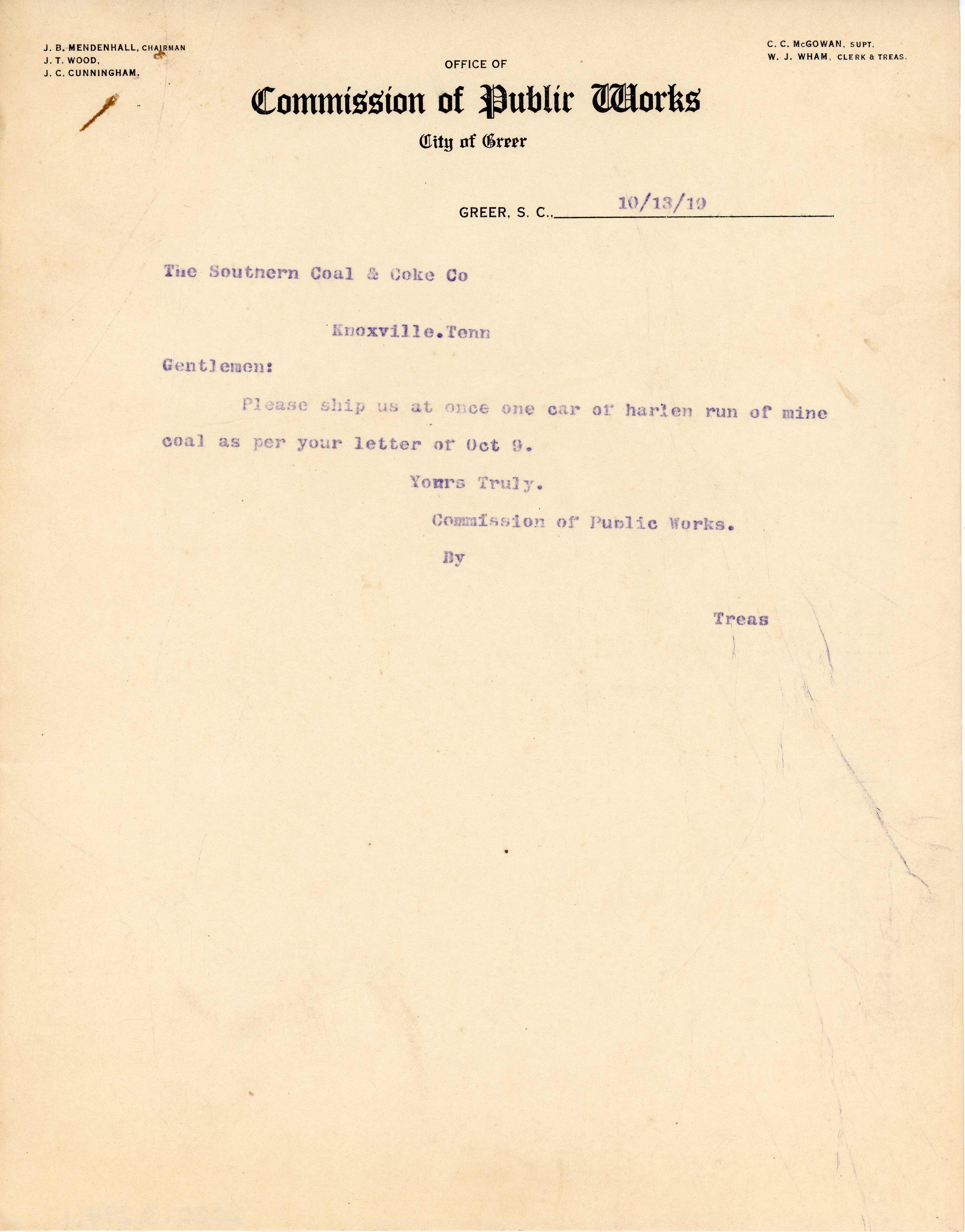- Letter 13 October 1919 W. J. Wham to The Southern Coal & Coke Co.