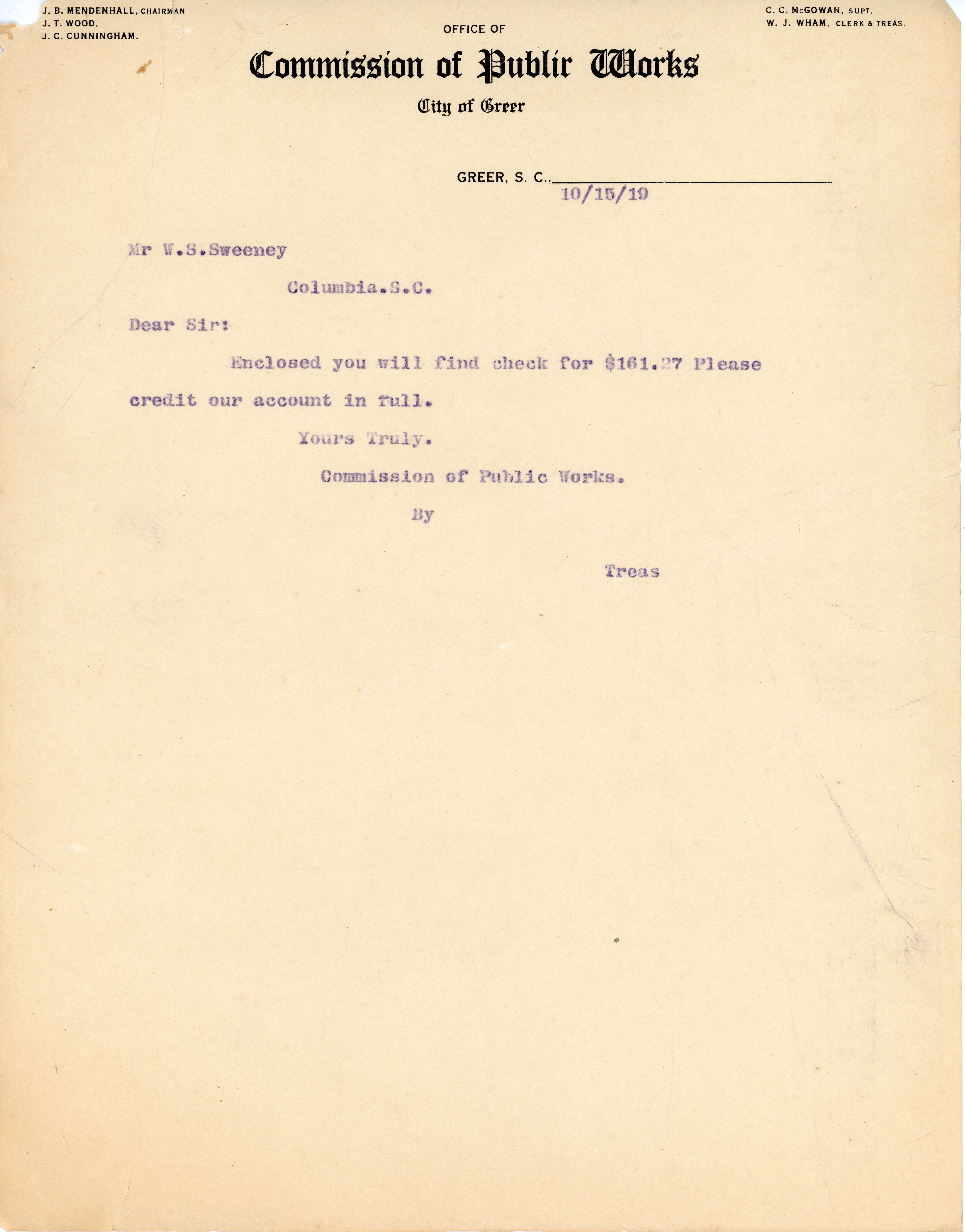 - Letter 15 October 1919 W. J. Wham to W. S. Sweeney