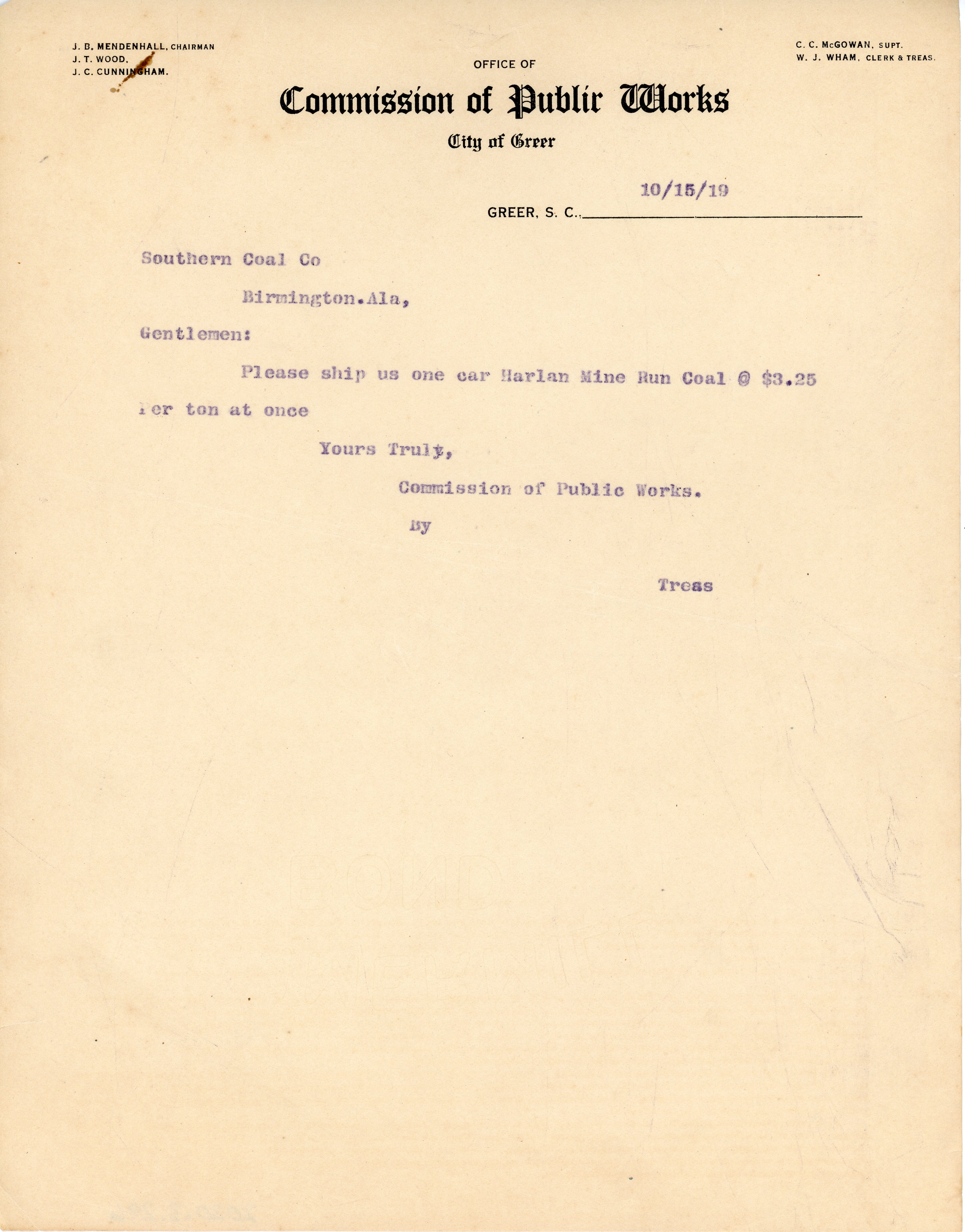 - Letter 15 October 1919 W. J. Wham to Southern Coal Co.