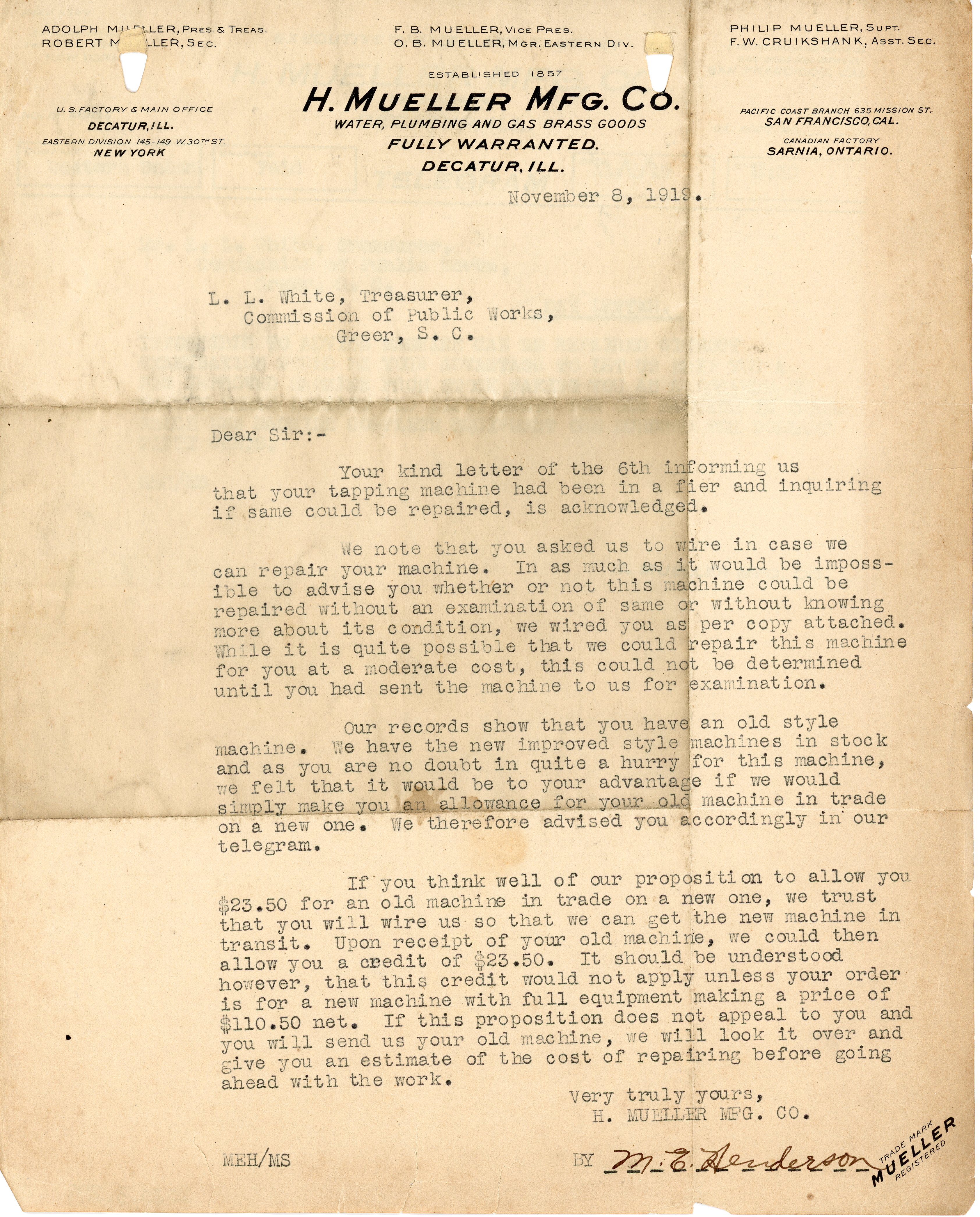 - Letter 8 November 1919 Letter M. E. Henderson to L. L. White