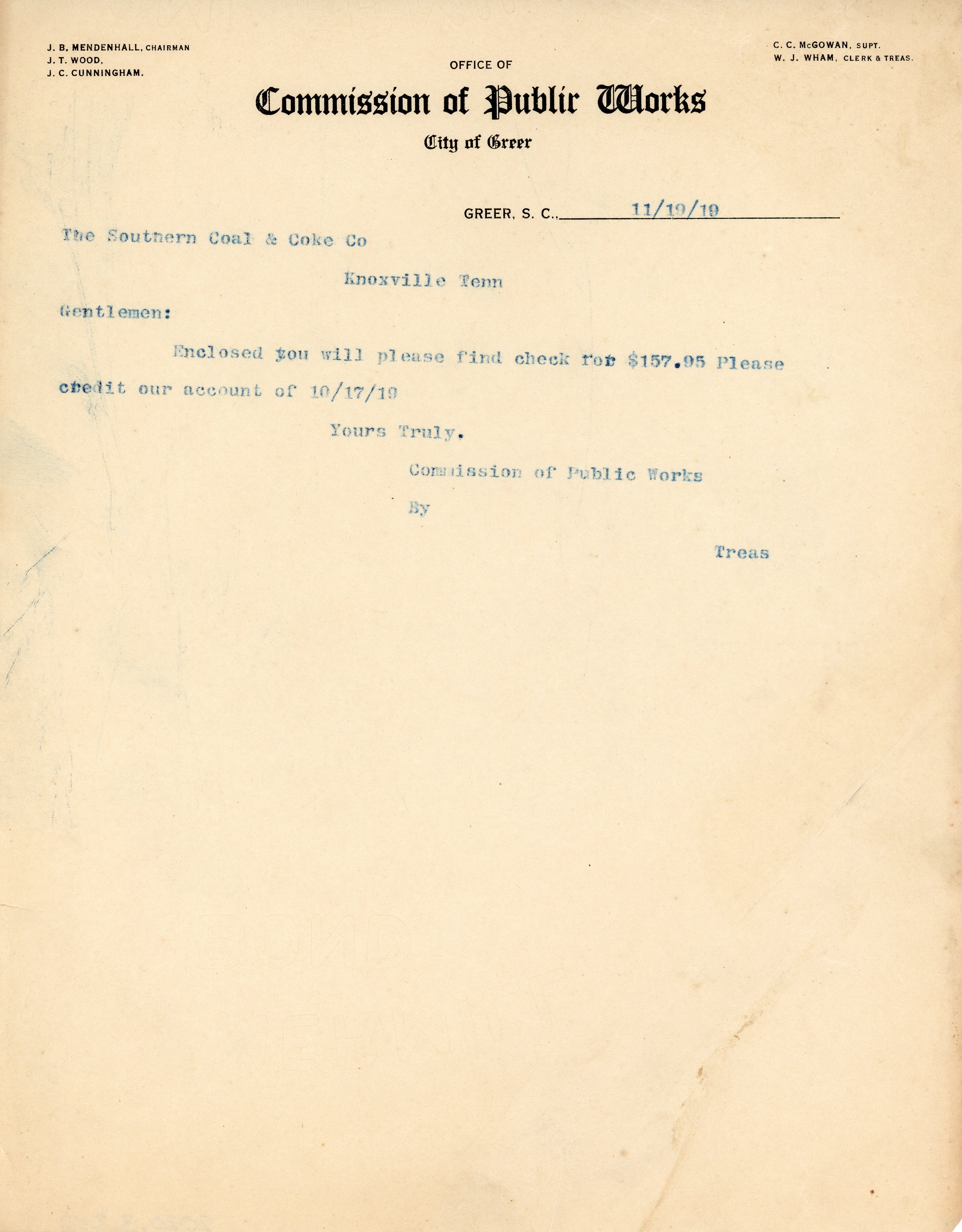 - Letter 19 November 1919 W. J. Wham to The Southern Coal & Coke Co.