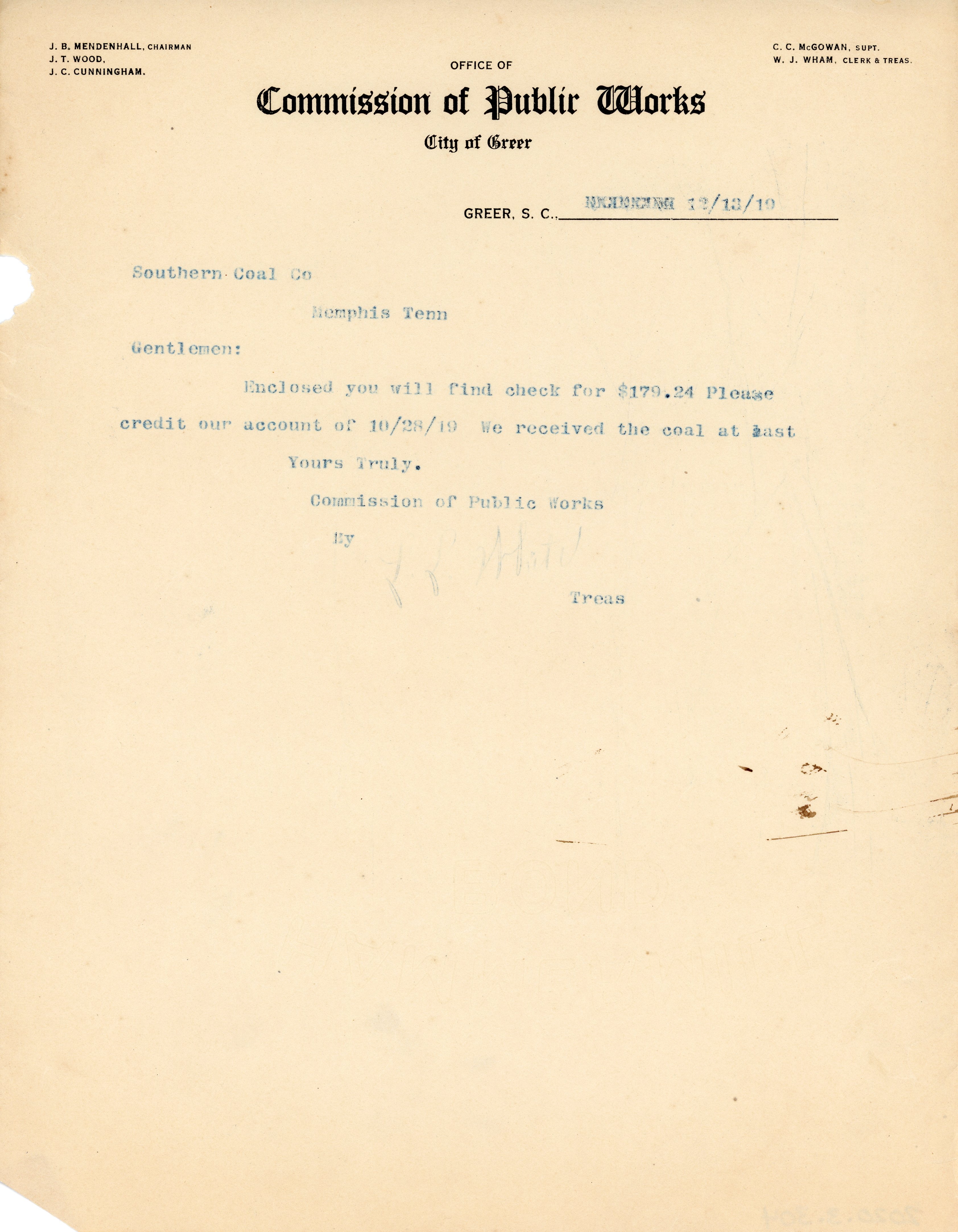 - Letter 13 December 1919 W. J. Wham to Southern Coal Co.