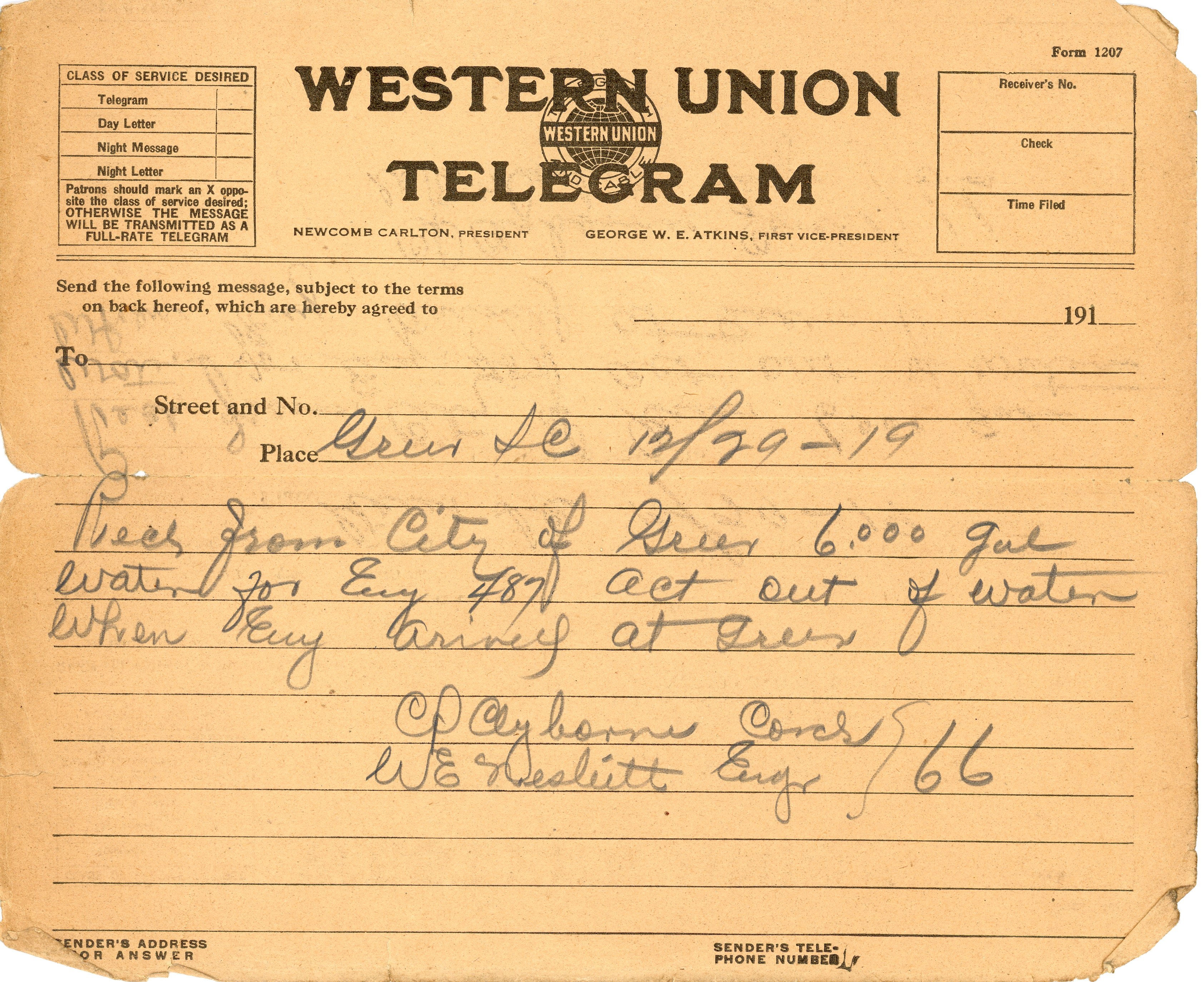 - Telegram 29 December 1919 W. E. Nesbitt to City of Greer Greer, S. C.