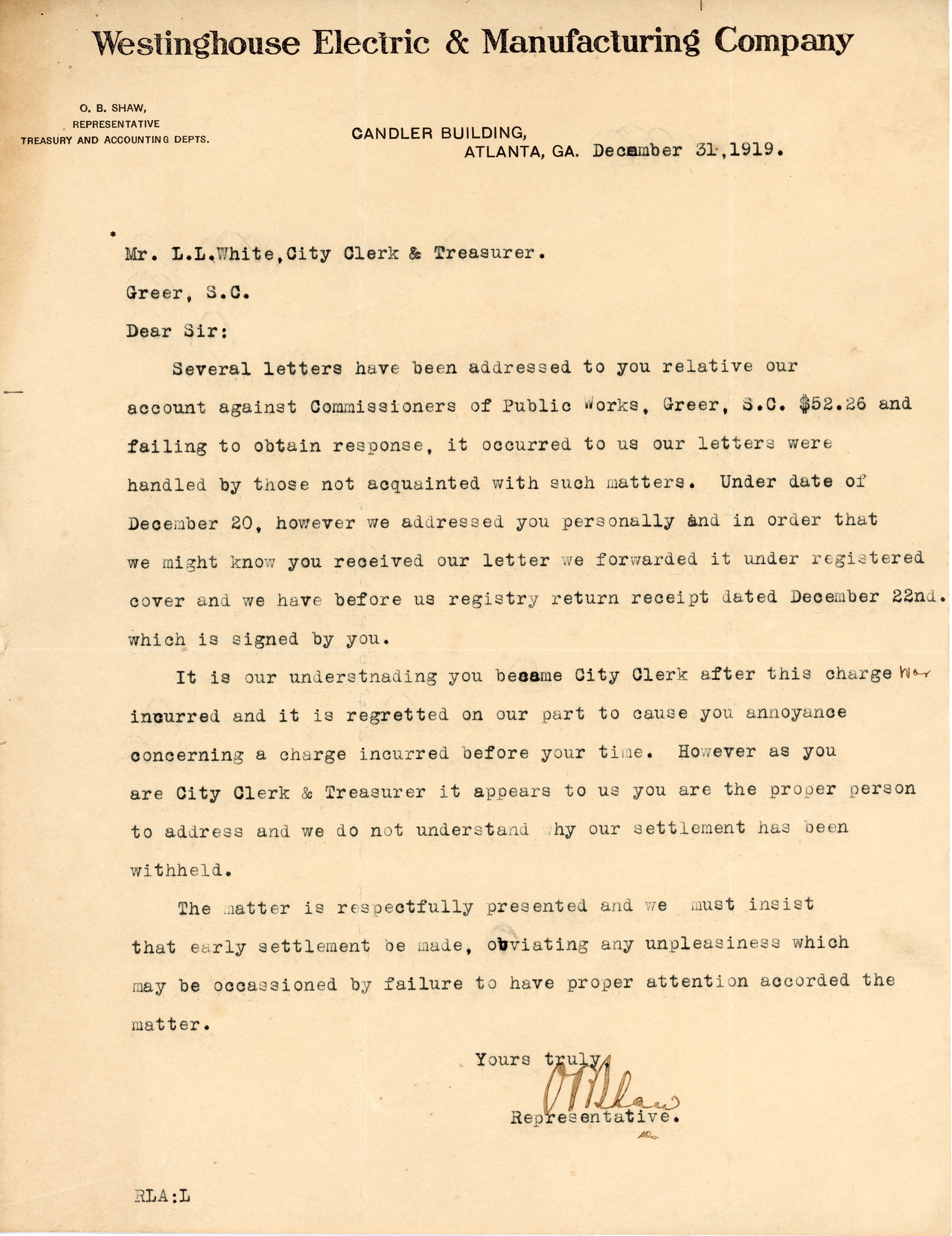- Letter 31 December 1919 R. L. A [illegible] to L. L. White