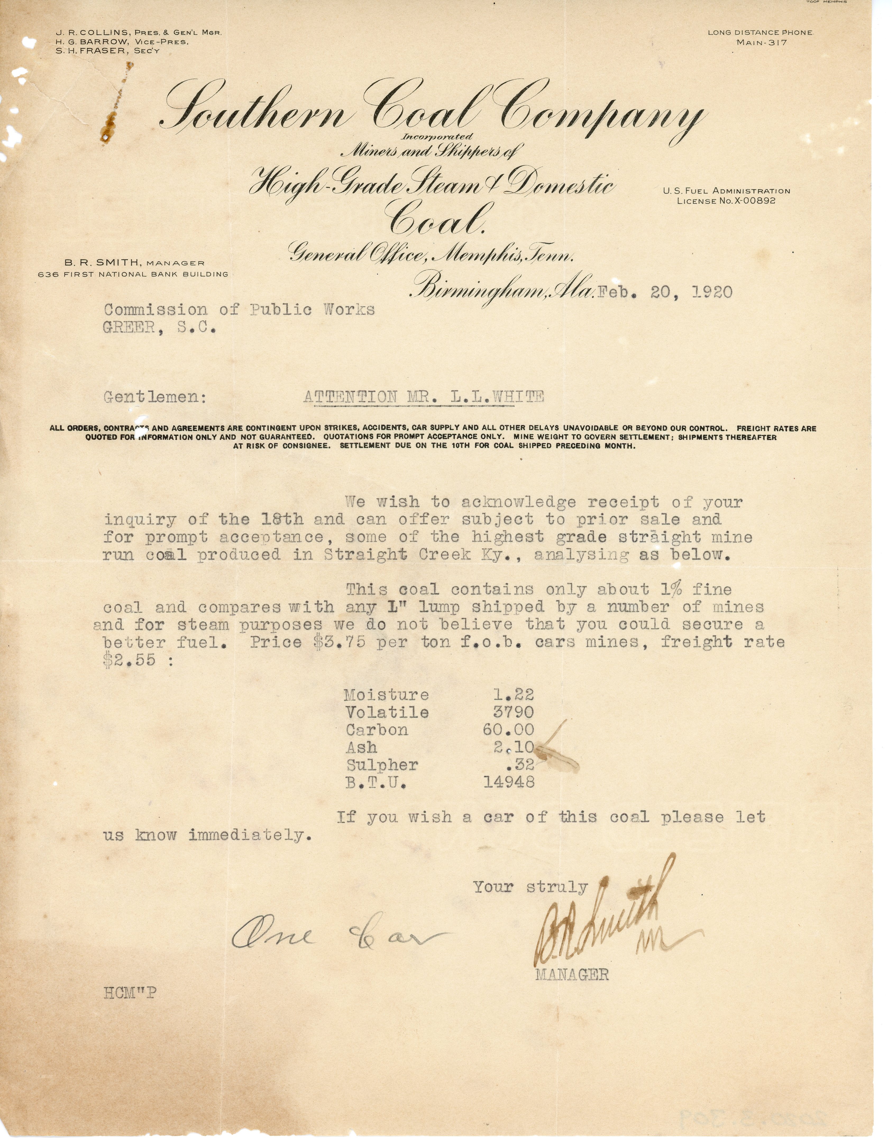 Part of Letter 20 February 1920 B. R. Smith to Commission of Public Works, Greer, S. C. Attention L. L. White