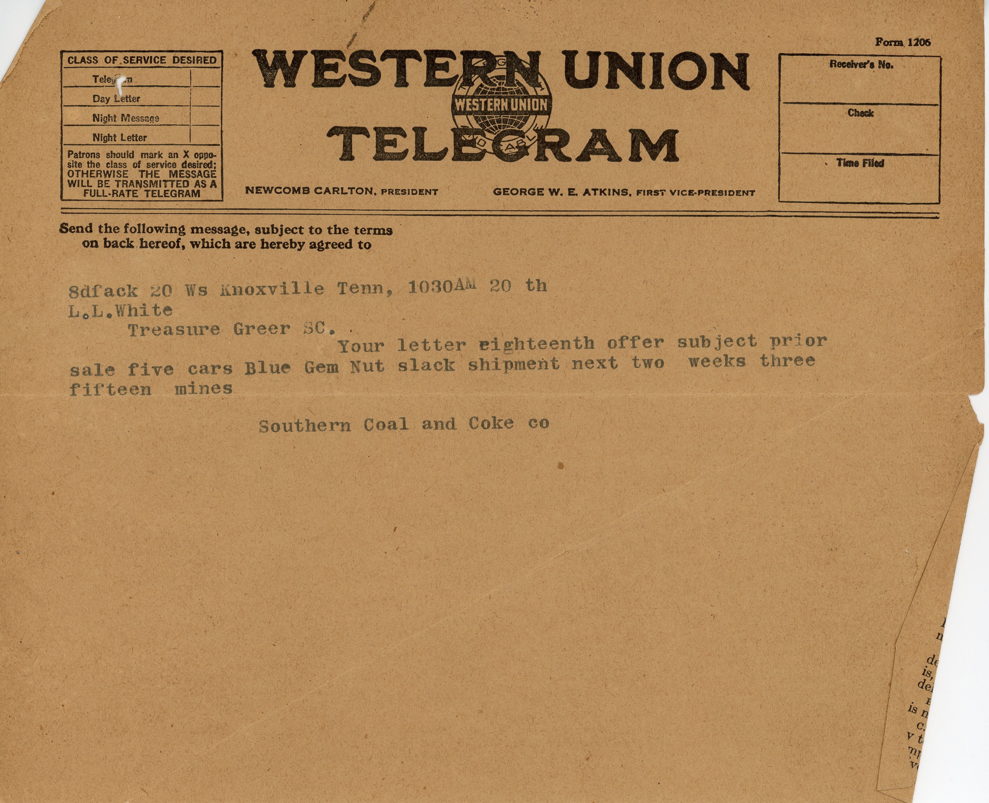 Telegram 20 February1920 Southern Coal and Coke Co. to L. L. White
