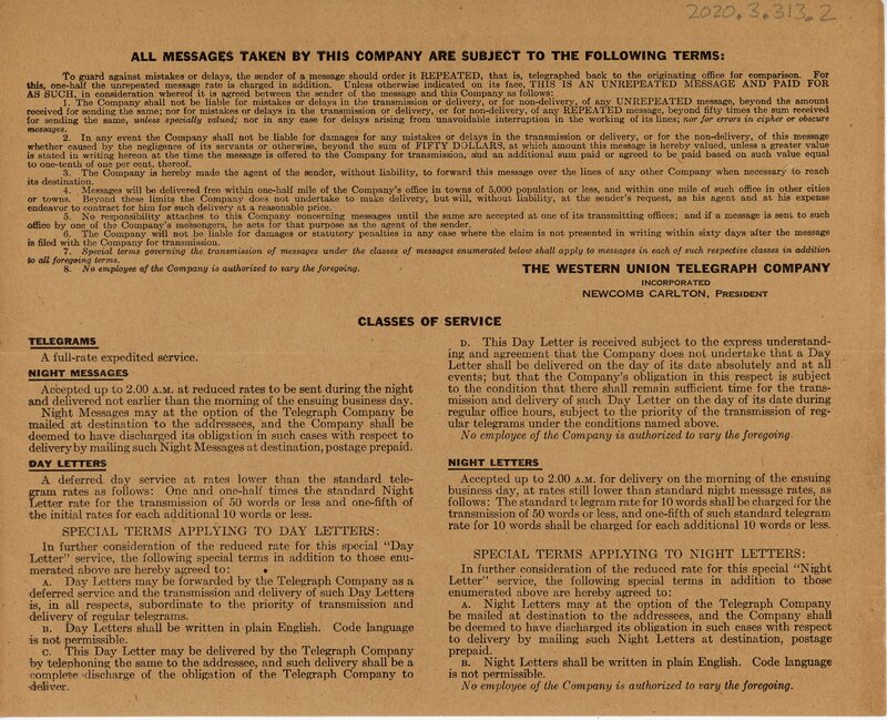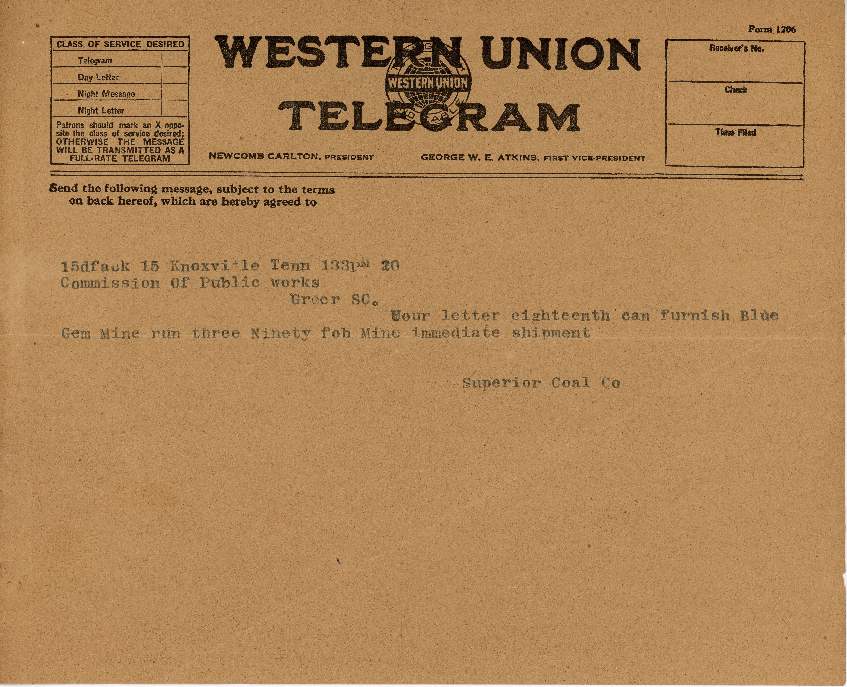 - Telegram 20 February 1920 Superior Coal Co. to Commission of Public Works Greer, S. C.
