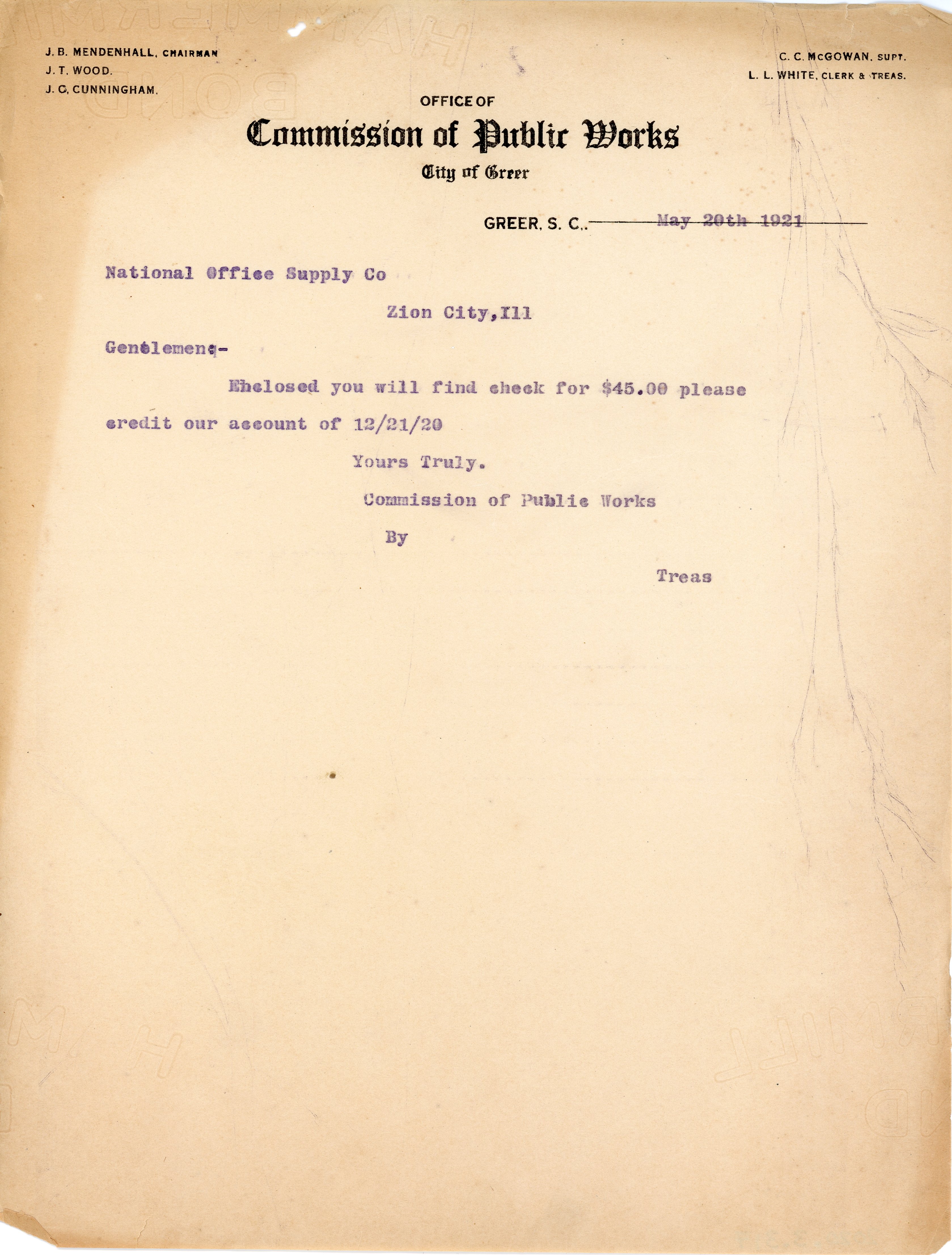 Letter 20 May 1921 L. L. White to National Office Supply Co.