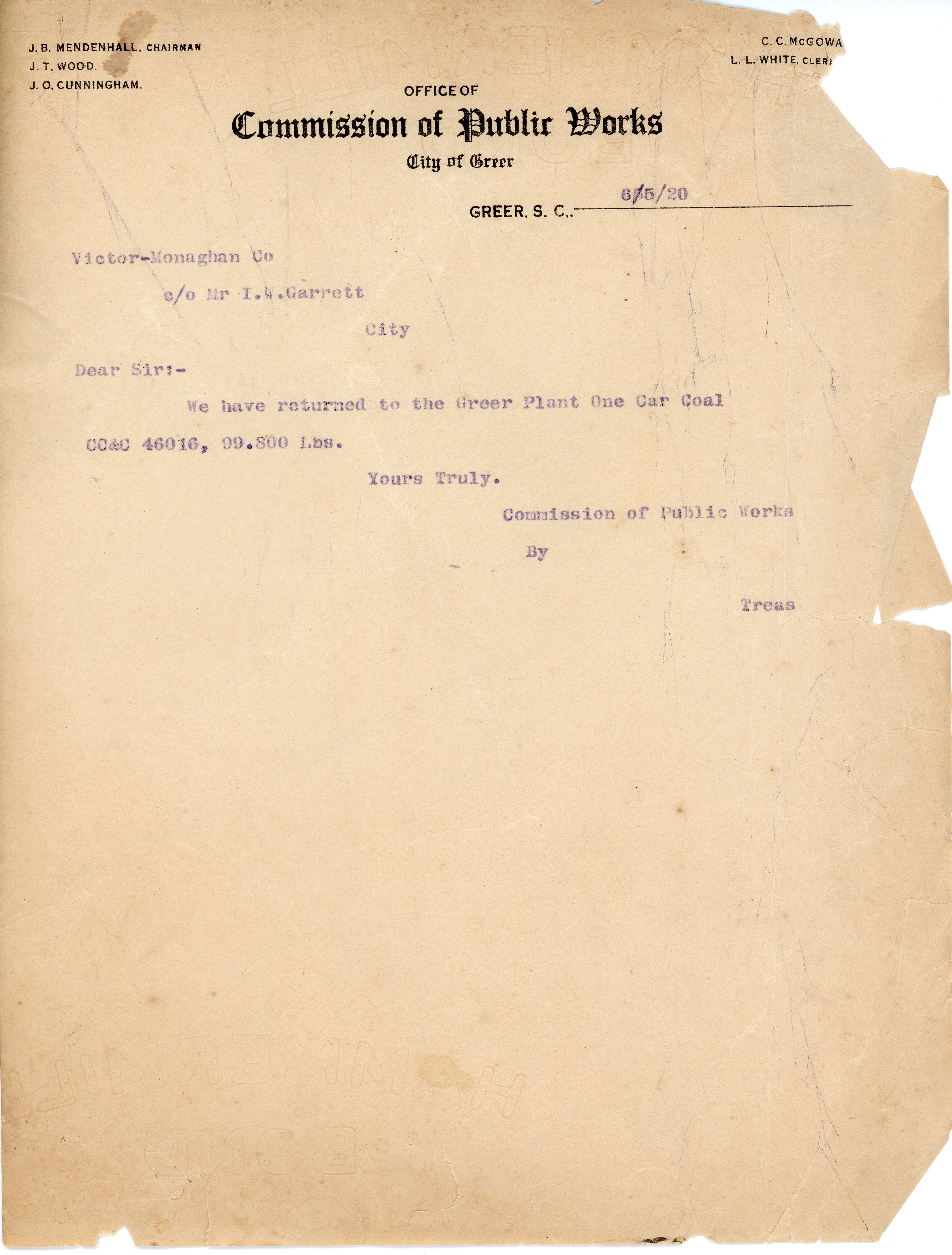 - Letter 25 June 1920 L. L. White to Victor-Monaghan Co.