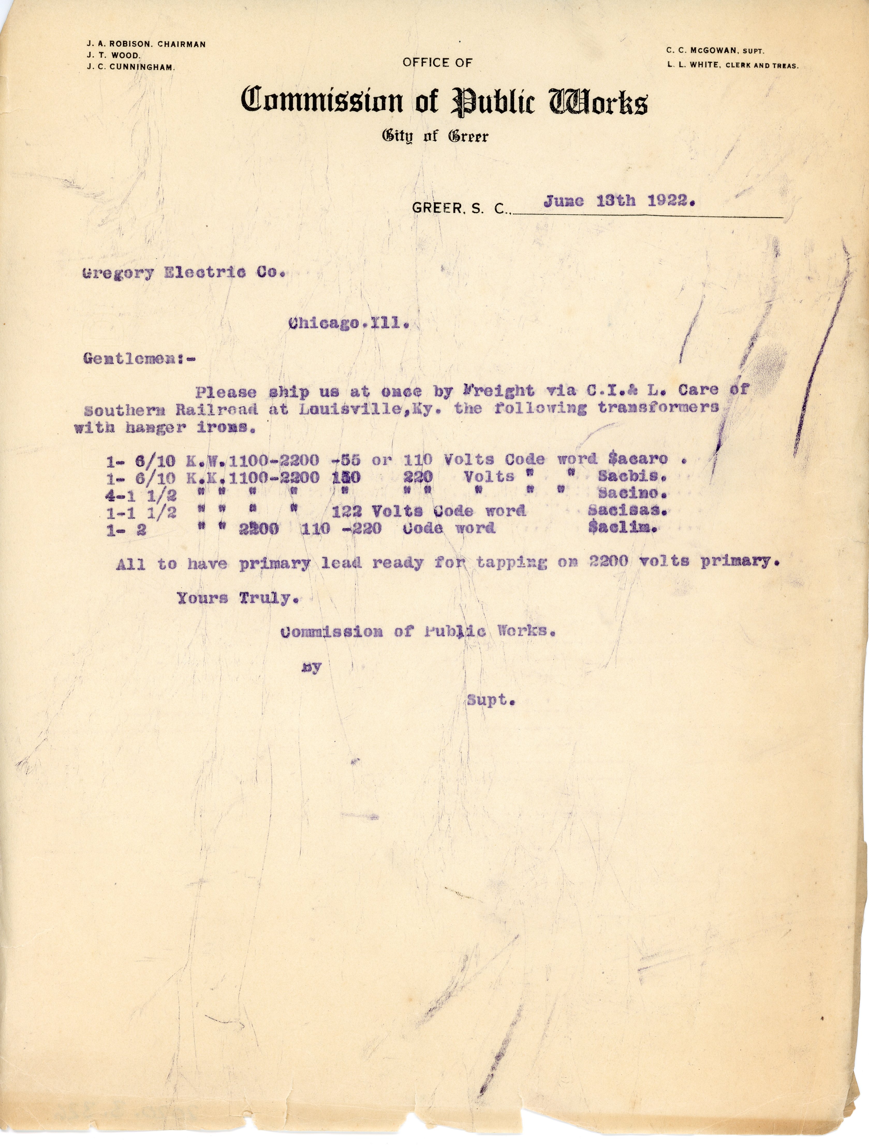 - Letter 13 June 1922 C. C. McGowan to Gregory Electric Co.