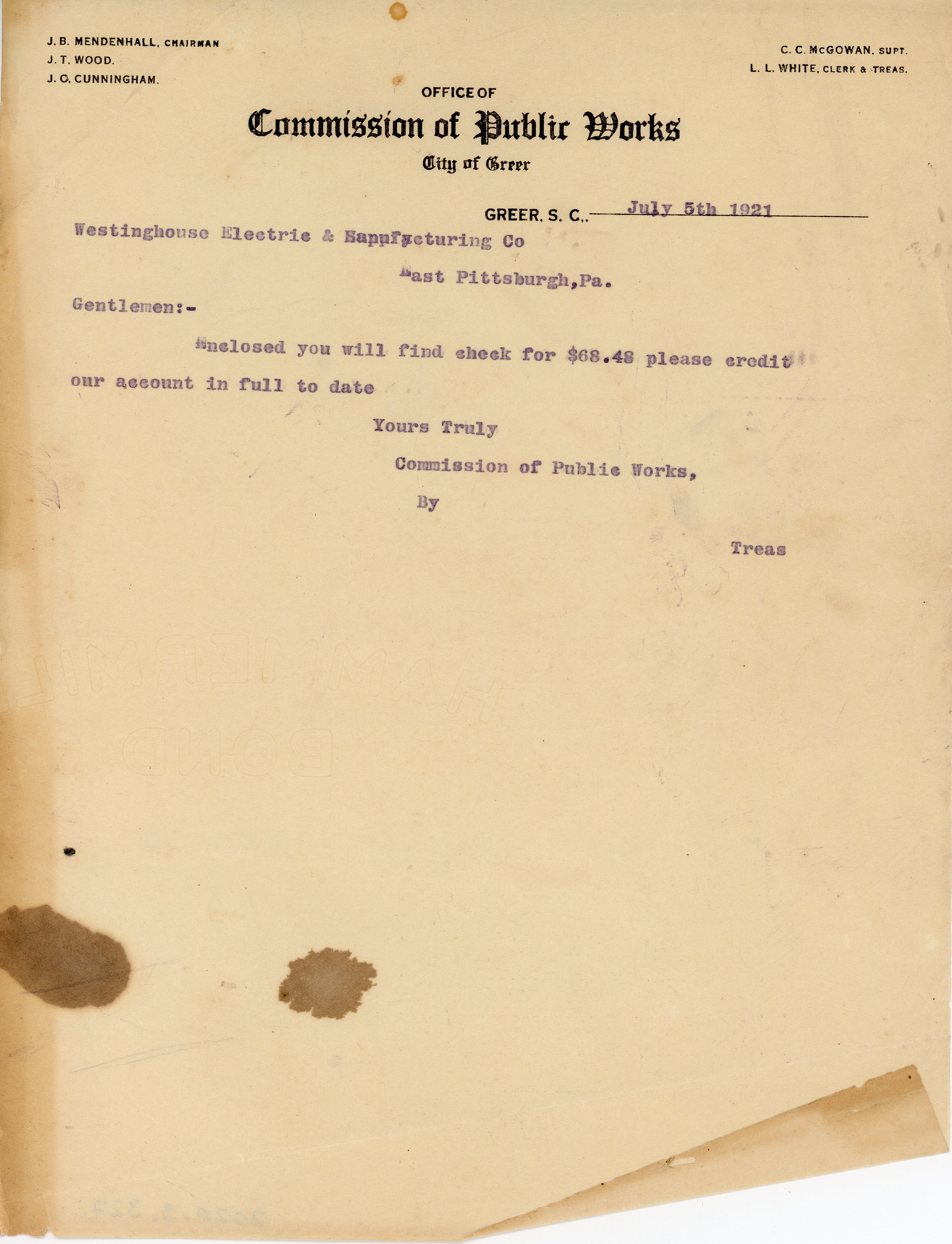 - Letter 5 July 1921 L. L. White to Westinghouse Electric & Manufacturing Co.